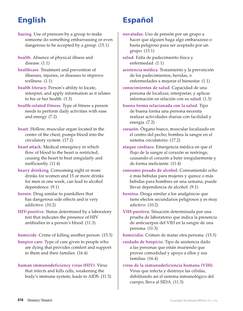 English Español Glossary/ Glosario Copyright Goodheart-Willcox Co., Inc. 616 hazing. Use of pressure by a group to make someone do something embarrassing or even dangerous to be accepted by a group. (15.1) novatadas. Uso de presión por un grupo a hacer que alguien haga algo embarazoso o hasta peligroso para ser aceptado por un grupo. (15.1) health. Absence of physical illness and disease. (1.1) salud. Falta de padecimiento física y enfermedad. (1.1) healthcare. Treatment and prevention of illnesses, injuries, or diseases to improve wellness. (1.1) asistencia médica. Tratamiento y la prevención de los padecimientos, heridas, o enfermedades a mejorar el bienestar. (1.1) health literacy. Person’s ability to locate, interpret, and apply information as it relates to his or her health. (1.3) conocimientos de salud. Capacidad de una persona de localizar, interpretar, y aplicar información en relación con su salud. (1.3) health-related fitness. Type of fitness a person needs to perform daily activities with ease and energy. (7.2) buena forma relacionada con la salud. Tipo de buena forma una persona necesita realizar actividades diarias con facilidad y energía. (7.2) heart. Hollow, muscular organ located in the center of the chest pumps blood into the circulatory system. (17.2) corazón. Órgano hueco, muscular localizado en el centro del pecho bombea la sangre en el sistema circulatorio. (17.2) heart attack. Medical emergency in which flow of blood to the heart is restricted, causing the heart to beat irregularly and inefficiently. (11.4) ataque cardíaco. Emergencia médica en que el flujo de la sangre al corazón se restringe, causando el corazón a batir irregularmente y de forma ineficiente. (11.4) heavy drinking. Consuming eight or more drinks for women and 15 or more drinks for men in one week can lead to alcohol dependence. (9.1) consumo pesado de alcohol. Consumiendo ocho o más bebidas para mujeres y quince o más bebidas para hombres en una semana puede llevar dependencia de alcohol. (9.1) heroin. Drug similar to painkillers that has dangerous side effects and is very addictive. (10.2) heroína. Droga similar a los analgésicos que tiene efectos secundarios peligrosos y es muy adictivo. (10.2) HIV-positive. Status determined by a laboratory test that indicates the presence of HIV antibodies in a person’s blood. (11.3) VIH-positivo. Situación determinada por una prueba de laboratorio que indica la presencia de anticuerpos del VIH en la sangre de una persona. (11.3) homicide. Crime of killing another person. (15.3) homicidio. Crimen de matar otra persona. (15.3) hospice care. Type of care given to people who are dying that provides comfort and support to them and their families. (16.4) cuidado de hospicio. Tipo de asistencia dado a las personas que están muriendo que provee comodidad y apoyo a ellos y sus familias. (16.4) human immunodeficiency virus (HIV). Virus that infects and kills cells, weakening the body’s immune system leads to AIDS. (11.3) virus de la inmunodeficiencia humana (VIH). Virus que infecta y destruye las células, debilitando así el sistema inmunológico del cuerpo lleva al SIDA. (11.3)