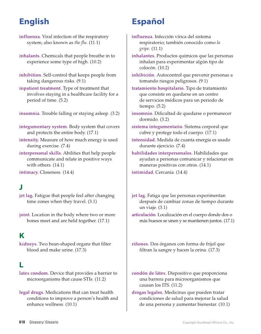 English Español Glossary/ Glosario Copyright Goodheart-Willcox Co., Inc. 618 influenza. Viral infection of the respiratory system also known as the flu. (11.1) influenza. Infección vírica del sistema respiratorio también conocido como la gripe. (11.1) inhalants. Chemicals that people breathe in to experience some type of high. (10.2) inhalantes. Productos químicos que las personas inhalan para experimentar algún tipo de colocón. (10.2) inhibition. Self-control that keeps people from taking dangerous risks. (9.1) inhibición. Autocontrol que prevenir personas a tomando riesgos peligrosos. (9.1) inpatient treatment. Type of treatment that involves staying in a healthcare facility for a period of time. (5.2) tratamiento hospitalario. Tipo de tratamiento que consiste en quedarse en un centro de servicios médicos para un periodo de tiempo. (5.2) insomnia. Trouble falling or staying asleep. (3.2) insomnio. Dificultad de quedarse o permanecer dormido. (3.2) integumentary system. Body system that covers and protects the entire body. (17.1) sistema integumentario. Sistema corporal que cubre y protege todo el cuerpo. (17.1) intensity. Measure of how much energy is used during exercise. (7.4) intensidad. Medida de cuanta energía es usado durante ejercicio. (7.4) interpersonal skills. Abilities that help people communicate and relate in positive ways with others. (14.1) habilidades interpersonales. Habilidades que ayudan a personas comunicar y relacionar en maneras positivas con otros. (14.1) intimacy. Closeness. (14.4) intimidad. Cercanía. (14.4) J jet lag. Fatigue that people feel after changing time zones when they travel. (3.1) jet lag. Fatiga que las personas experimentan después de cambiar zonas de tiempo durante un viaje. (3.1) joint. Location in the body where two or more bones meet and are held together. (17.1) articulación. Localización en el cuerpo donde dos o más huesos se unen y se mantienen juntos. (17.1) K kidneys. Two bean-shaped organs that filter blood and make urine. (17.3) riñones. Dos órganos con forma de frijol que filtran la sangre y hacen la orina. (17.3) L latex condom. Device that provides a barrier to microorganisms that cause STIs. (11.2) condón de látex. Dispositivo que proporciona una barrera para microorganismos que causan los ITS. (11.2) legal drugs. Medications that can treat health conditions to improve a person’s health and enhance wellness. (10.1) drogas legales. Medicinas que pueden tratar condiciones de salud para mejorar la salud de una persona y aumentar bienestar. (10.1)