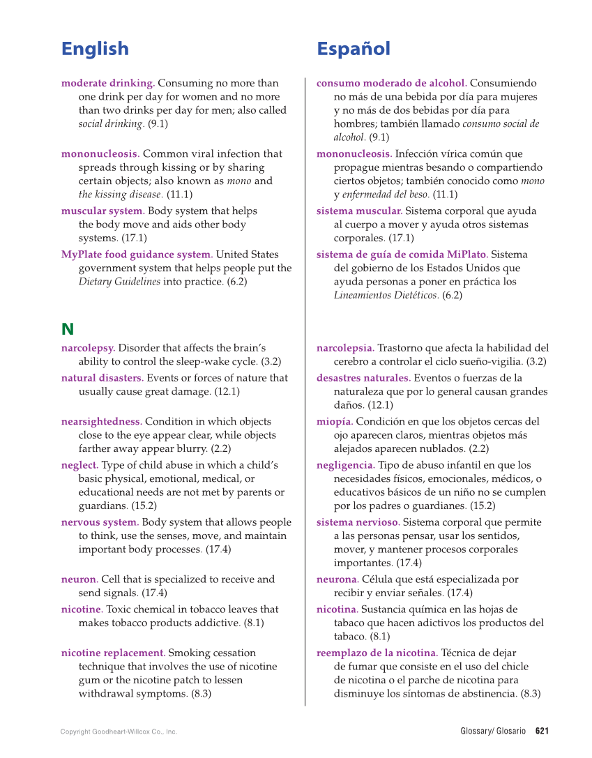 English Español Copyright Goodheart-Willcox Co., Inc. Glossary/ Glosario 621 moderate drinking. Consuming no more than one drink per day for women and no more than two drinks per day for men also called social drinking. (9.1) consumo moderado de alcohol. Consumiendo no más de una bebida por día para mujeres y no más de dos bebidas por día para hombres también llamado consumo social de alcohol. (9.1) mononucleosis. Common viral infection that spreads through kissing or by sharing certain objects also known as mono and the kissing disease. (11.1) mononucleosis. Infección vírica común que propague mientras besando o compartiendo ciertos objetos también conocido como mono y enfermedad del beso. (11.1) muscular system. Body system that helps the body move and aids other body systems. (17.1) sistema muscular. Sistema corporal que ayuda al cuerpo a mover y ayuda otros sistemas corporales. (17.1) MyPlate food guidance system. United States government system that helps people put the Dietary Guidelines into practice. (6.2) sistema de guía de comida MiPlato. Sistema del gobierno de los Estados Unidos que ayuda personas a poner en práctica los Lineamientos Dietéticos. (6.2) N narcolepsy. Disorder that affects the brain’s ability to control the sleep-wake cycle. (3.2) narcolepsia. Trastorno que afecta la habilidad del cerebro a controlar el ciclo sueño-vigilia. (3.2) natural disasters. Events or forces of nature that usually cause great damage. (12.1) desastres naturales. Eventos o fuerzas de la naturaleza que por lo general causan grandes daños. (12.1) nearsightedness. Condition in which objects close to the eye appear clear, while objects farther away appear blurry. (2.2) miopía. Condición en que los objetos cercas del ojo aparecen claros, mientras objetos más alejados aparecen nublados. (2.2) neglect. Type of child abuse in which a child’s basic physical, emotional, medical, or educational needs are not met by parents or guardians. (15.2) negligencia. Tipo de abuso infantil en que los necesidades físicos, emocionales, médicos, o educativos básicos de un niño no se cumplen por los padres o guardianes. (15.2) nervous system. Body system that allows people to think, use the senses, move, and maintain important body processes. (17.4) sistema nervioso. Sistema corporal que permite a las personas pensar, usar los sentidos, mover, y mantener procesos corporales importantes. (17.4) neuron. Cell that is specialized to receive and send signals. (17.4) neurona. Célula que está especializada por recibir y enviar señales. (17.4) nicotine. Toxic chemical in tobacco leaves that makes tobacco products addictive. (8.1) nicotina. Sustancia química en las hojas de tabaco que hacen adictivos los productos del tabaco. (8.1) nicotine replacement. Smoking cessation technique that involves the use of nicotine gum or the nicotine patch to lessen withdrawal symptoms. (8.3) reemplazo de la nicotina. Técnica de dejar de fumar que consiste en el uso del chicle de nicotina o el parche de nicotina para disminuye los síntomas de abstinencia. (8.3)