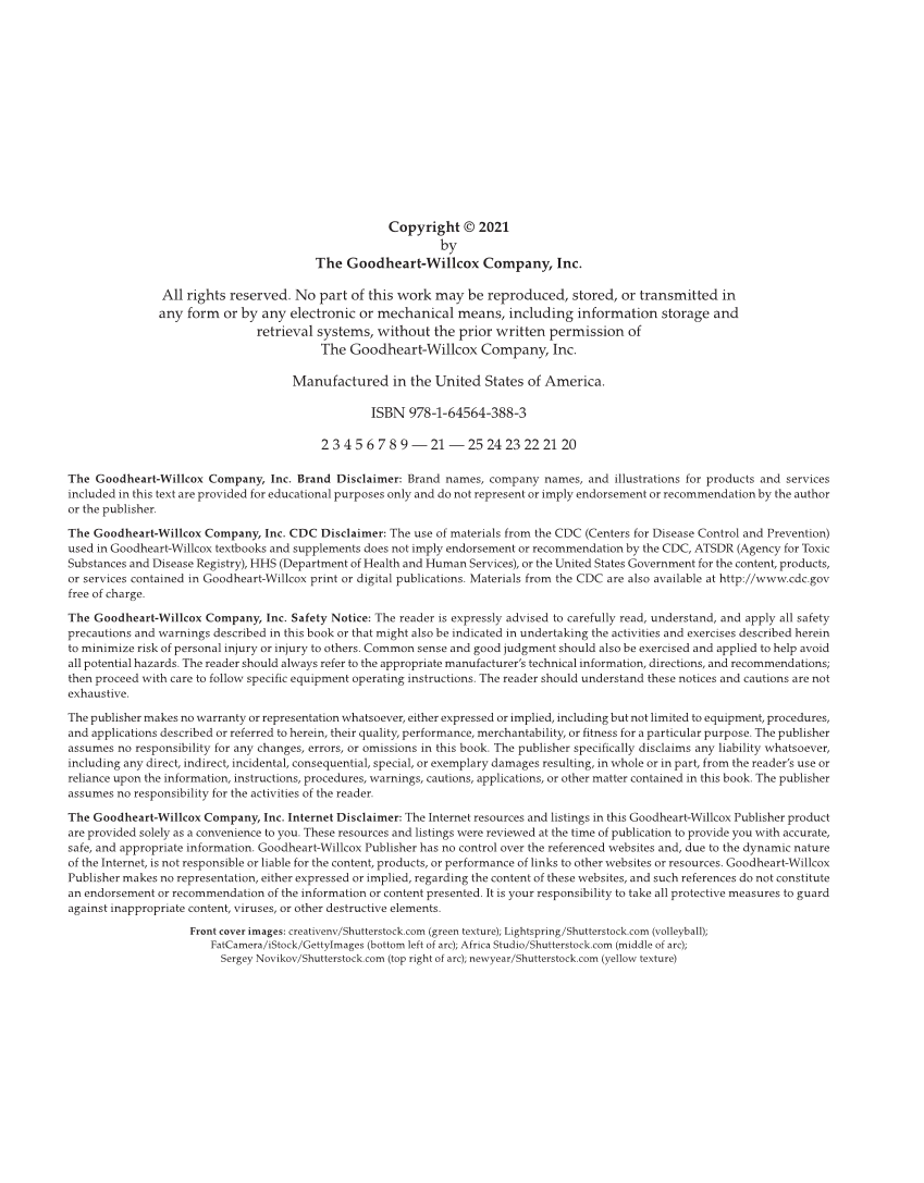 Copyright © 2021 by The Goodheart-Willcox Company, Inc. All rights reserved. No part of this work may be reproduced, stored, or transmitted in any form or by any electronic or mechanical means, including information storage and retrieval systems, without the prior written permission of The Goodheart-Willcox Company, Inc. Manufactured in the United States of America. ISBN 978-1-64564-388-3 2 3 4 5 6 7 8 9 — 21 — 25 24 23 22 21 20 The Goodheart-Willcox Company, Inc. Brand Disclaimer: Brand names, company names, and illustrations for products and services included in this text are provided for educational purposes only and do not represent or imply endorsement or recommendation by the author or the publisher. The Goodheart-Willcox Company, Inc. CDC Disclaimer: The use of materials from the CDC (Centers for Disease Control and Prevention) used in Goodheart-Willcox textbooks and supplements does not imply endorsement or recommendation by the CDC, ATSDR (Agency for Toxic Substances and Disease Registry), HHS (Department of Health and Human Services), or the United States Government for the content, products, or services contained in Goodheart-Willcox print or digital publications. Materials from the CDC are also available at http://www.cdc.gov free of charge. The Goodheart-Willcox Company, Inc. Safety Notice: The reader is expressly advised to carefully read, understand, and apply all safety precautions and warnings described in this book or that might also be indicated in undertaking the activities and exercises described herein to minimize risk of personal injury or injury to others. Common sense and good judgment should also be exercised and applied to help avoid all potential hazards. The reader should always refer to the appropriate manufacturer’s technical information, directions, and recommendations then proceed with care to follow specifi c equipment operating instructions. The reader should understand these notices and cautions are not exhaustive. The publisher makes no warranty or representation whatsoever, either expressed or implied, including but not limited to equipment, procedures, and applications described or referred to herein, their quality, performance, merchantability, or fi tness for a particular purpose. The publisher assumes no responsibility for any changes, errors, or omissions in this book. The publisher specifi cally disclaims any liability whatsoever, including any direct, indirect, incidental, consequential, special, or exemplary damages resulting, in whole or in part, from the reader’s use or reliance upon the information, instructions, procedures, warnings, cautions, applications, or other matter contained in this book. The publisher assumes no responsibility for the activities of the reader. The Goodheart-Willcox Company, Inc. Internet Disclaimer: The Internet resources and listings in this Goodheart-Willcox Publisher product are provided solely as a convenience to you. These resources and listings were reviewed at the time of publication to provide you with accurate, safe, and appropriate information. Goodheart-Willcox Publisher has no control over the referenced websites and, due to the dynamic nature of the Internet, is not responsible or liable for the content, products, or performance of links to other websites or resources. Goodheart-Willcox Publisher makes no representation, either expressed or implied, regarding the content of these websites, and such references do not constitute an endorsement or recommendation of the information or content presented. It is your responsibility to take all protective measures to guard against inappropriate content, viruses, or other destructive elements. Front cover images: creativenv/Shutterstock.com (green texture) Lightspring/Shutterstock.com (volleyball) FatCamera/iStock/GettyImages (bottom left of arc) Africa Studio/Shutterstock.com (middle of arc) Sergey Novikov/Shutterstock.com (top right of arc) newyear/Shutterstock.com (yellow texture)