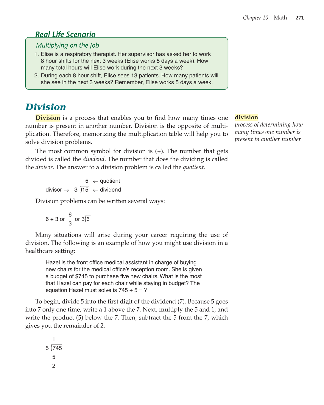 To begin, divide 5 into the fi rst digit of the dividend (7). Because 5 goes