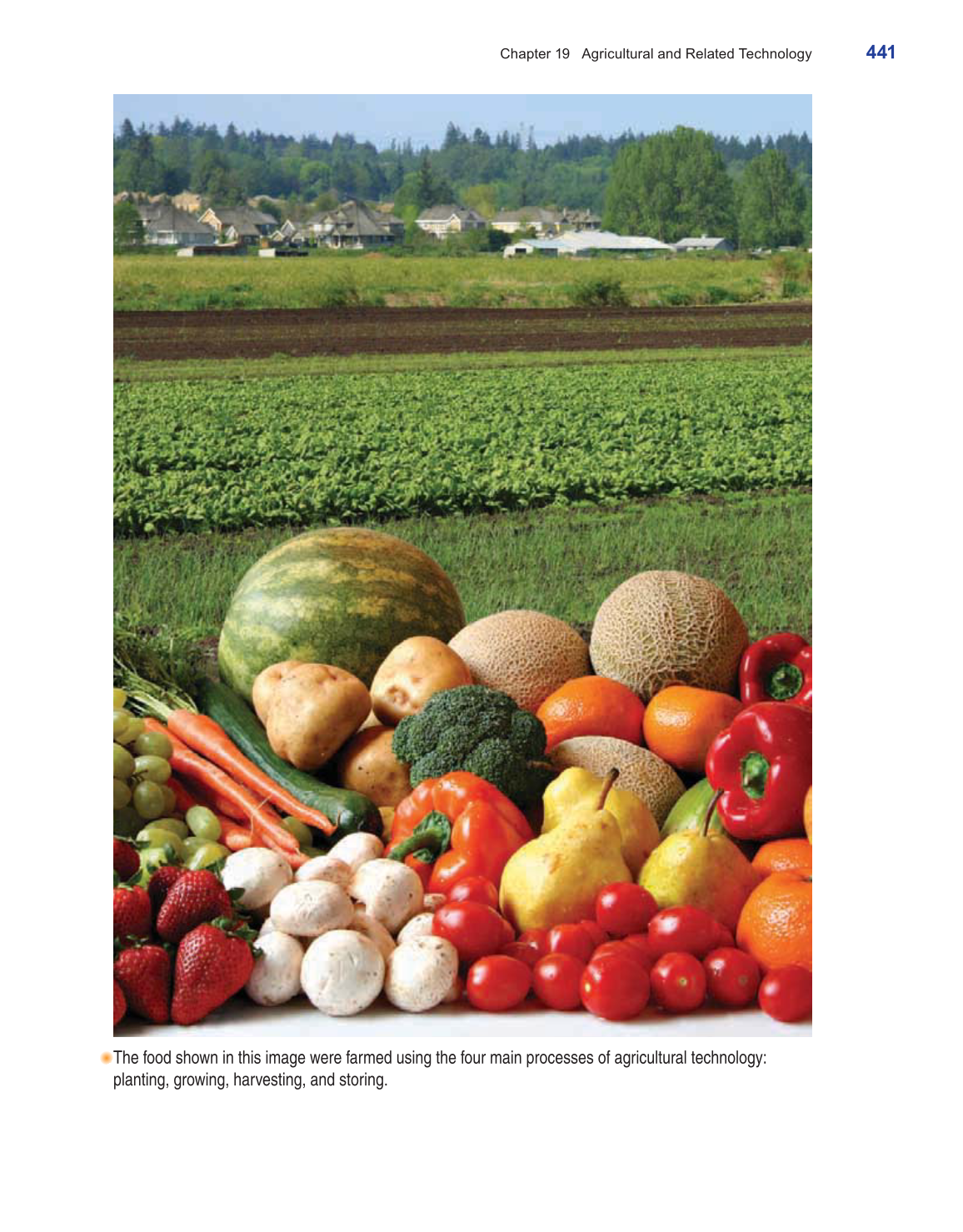 The food shown in this image were farmed using the four main processes of agricultural technology: planting, growing, harvesting, and storing. Chapter 19 Agricultural and Related Technology 441