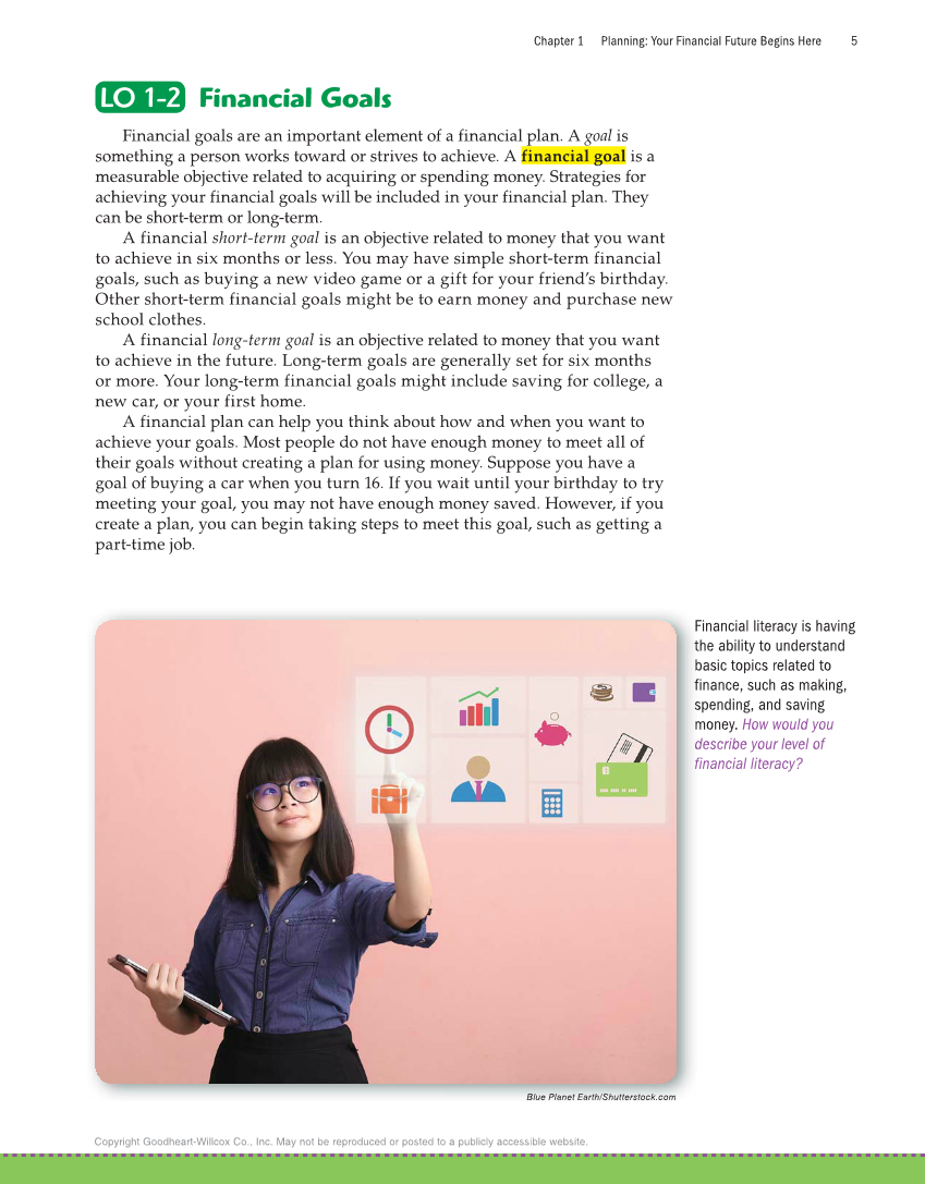 Chapter 1 Planning: Your Financial Future Begins Here 5 Copyright Goodheart-Willcox Co., Inc. May not be reproduced or posted to a publicly accessible website. LO 1-2 LO 1-2 Financial Goals Financial goals are an important element of a financial plan. A goal is something a person works toward or strives to achieve. A financial goal is a measurable objective related to acquiring or spending money. Strategies for achieving your financial goals will be included in your financial plan. They can be short-term or long-term. A financial short-term goal is an objective related to money that you want to achieve in six months or less. You may have simple short-term financial goals, such as buying a new video game or a gift for your friend’s birthday. Other short-term financial goals might be to earn money and purchase new school clothes. A financial long-term goal is an objective related to money that you want to achieve in the future. Long-term goals are generally set for six months or more. Your long-term financial goals might include saving for college, a new car, or your first home. A financial plan can help you think about how and when you want to achieve your goals. Most people do not have enough money to meet all of their goals without creating a plan for using money. Suppose you have a goal of buying a car when you turn 16. If you wait until your birthday to try meeting your goal, you may not have enough money saved. However, if you create a plan, you can begin taking steps to meet this goal, such as getting a part-time job. Blue Planet Earth/Shutterstock.comm Financial literacy is having the ability to understand basic topics related to finance, such as making, spending, and saving money. How would you describe your level of financial literacy? B lue Planet Earth/Shutterstock.co F t b f s m d f