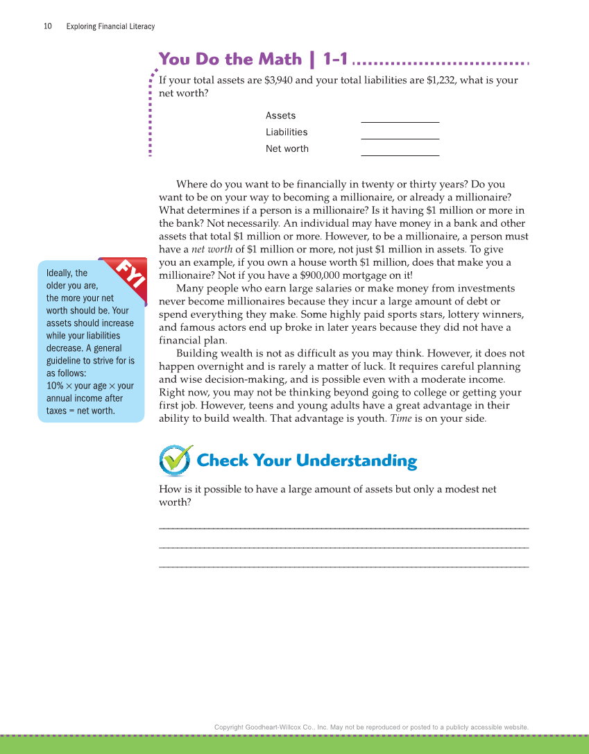 Exploring Financial Literacy 10 Copyright Goodheart-Willcox Co., Inc. May not be reproduced or posted to a publicly accessible website. You Do the Math | 1-1 If your total assets are $3,940 and your total liabilities are $1,232, what is your net worth? Assets Liabilities Net worth Where do you want to be financially in twenty or thirty years? Do you want to be on your way to becoming a millionaire, or already a millionaire? What determines if a person is a millionaire? Is it having $1 million or more in the bank? Not necessarily. An individual may have money in a bank and other assets that total $1 million or more. However, to be a millionaire, a person must have a net worth of $1 million or more, not just $1 million in assets. To give you an example, if you own a house worth $1 million, does that make you a millionaire? Not if you have a $900,000 mortgage on it! Many people who earn large salaries or make money from investments never become millionaires because they incur a large amount of debt or spend everything they make. Some highly paid sports stars, lottery winners, and famous actors end up broke in later years because they did not have a financial plan. Building wealth is not as difficult as you may think. However, it does not happen overnight and is rarely a matter of luck. It requires careful planning and wise decision-making, and is possible even with a moderate income. Right now, you may not be thinking beyond going to college or getting your first job. However, teens and young adults have a great advantage in their ability to build wealth. That advantage is youth. Time is on your side. Check Your Understanding How is it possible to have a large amount of assets but only a modest net worth? __________________________________________________________________________________ __________________________________________________________________________________ __________________________________________________________________________________ Ideally, the older you are, the more your net worth should be. Your assets should increase while your liabilities decrease. A general guideline to strive for is as follows: 10% × your age × your annual income after taxes = net worth. F F Y I