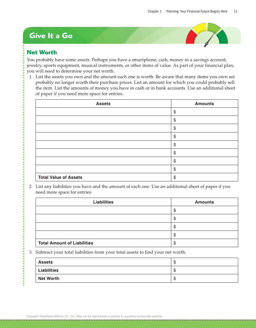 Chapter 1 Planning: Your Financial Future Begins Here 11 Copyright Goodheart-Willcox Co., Inc. May not be reproduced or posted to a publicly accessible website. Give It a Go Give It a Go Net Worth You probably have some assets. Perhaps you have a smartphone, cash, money in a savings account, jewelry, sports equipment, musical instruments, or other items of value. As part of your financial plan, you will need to determine your net worth. 1. List the assets you own and the amount each one is worth. Be aware that many items you own are probably no longer worth their purchase prices. List an amount for which you could probably sell the item. List the amounts of money you have in cash or in bank accounts. Use an additional sheet of paper if you need more space for entries. Assets Amounts $ $ $ $ $ $ $ $ Total Value of Assets $ 2. List any liabilities you have and the amount of each one. Use an additional sheet of paper if you need more space for entries. Liabilities Amounts $ $ $ $ Total Amount of Liabilities $ 3. Subtract your total liabilities from your total assets to find your net worth. Assets $ Liabilities $ Net Worth $