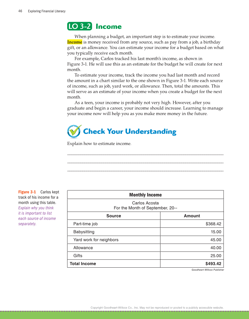 Exploring Financial Literacy 46 Copyright Goodheart-Willcox Co., Inc. May not be reproduced or posted to a publicly accessible website. LO 3-2 LO 3-2 Income When planning a budget, an important step is to estimate your income. Income is money received from any source, such as pay from a job, a birthday gift, or an allowance. You can estimate your income for a budget based on what you typically receive each month. For example, Carlos tracked his last month’s income, as shown in Figure 3-1. He will use this as an estimate for the budget he will create for next month. To estimate your income, track the income you had last month and record the amount in a chart similar to the one shown in Figure 3-1. Write each source of income, such as job, yard work, or allowance. Then, total the amounts. This will serve as an estimate of your income when you create a budget for the next month. As a teen, your income is probably not very high. However, after you graduate and begin a career, your income should increase. Learning to manage your income now will help you as you make more money in the future. Check Your Understanding Explain how to estimate income. __________________________________________________________________________________ __________________________________________________________________________________ __________________________________________________________________________________ Monthly Income Carlos Acosta For the Month of September, 20-- Source Amount Part-time job $368.42 Babysitting 15.00 Yard work for neighbors 45.00 Allowance 40.00 Gifts 25.00 Total Income $493.42 Goodheart-Willcox Publisher Figure 3-1 Carlos kept track of his income for a month using this table. Explain why you think it is important to list each source of income separately.