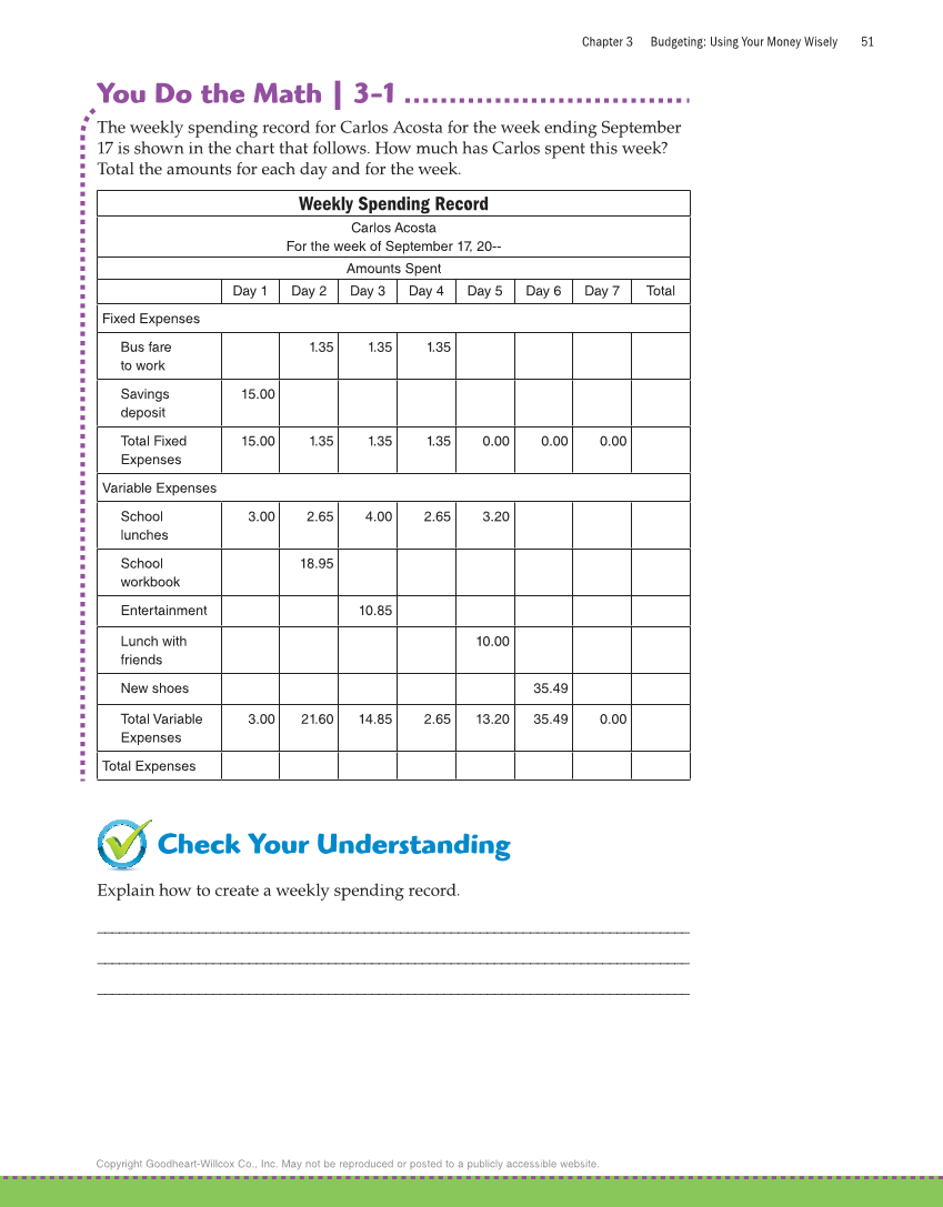 Chapter 3 Budgeting: Using Your Money Wisely 51 Copyright Goodheart-Willcox Co., Inc. May not be reproduced or posted to a publicly accessible website. You Do the Math | 3-1 The weekly spending record for Carlos Acosta for the week ending September 17 is shown in the chart that follows. How much has Carlos spent this week? Total the amounts for each day and for the week. Weekly Spending Record Carlos Acosta For the week of September 17, 20-- Amounts Spent Day 1 Day 2 Day 3 Day 4 Day 5 Day 6 Day 7 Total Fixed Expenses Bus fare to work 1.35 1.35 1.35 Savings deposit 15.00 Total Fixed Expenses 15.00 1.35 1.35 1.35 0.00 0.00 0.00 Variable Expenses School lunches 3.00 2.65 4.00 2.65 3.20 School workbook 18.95 Entertainment 10.85 Lunch with friends 10.00 New shoes 35.49 Total Variable Expenses 3.00 21.60 14.85 2.65 13.20 35.49 0.00 Total Expenses Check Your Understanding Explain how to create a weekly spending record. __________________________________________________________________________________ __________________________________________________________________________________ __________________________________________________________________________________