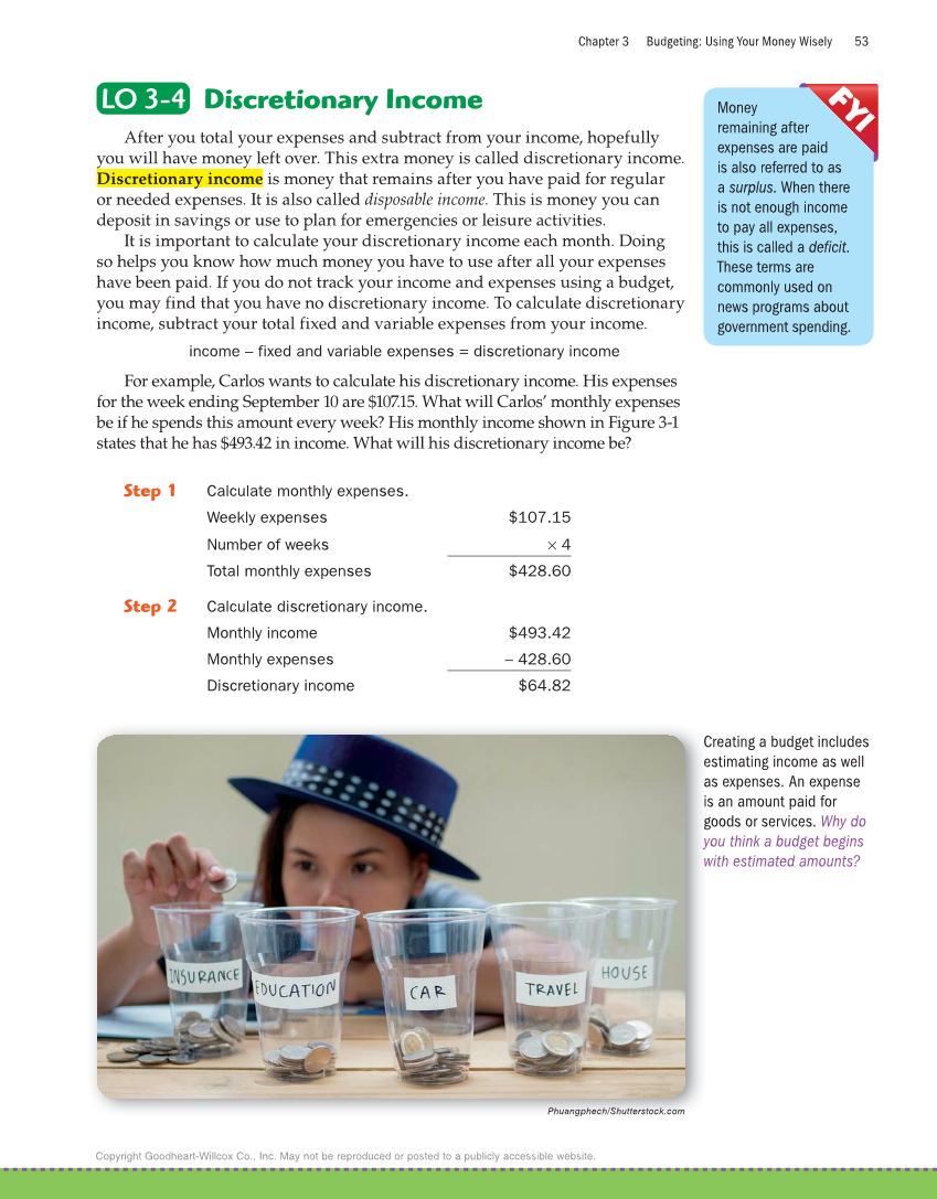 Chapter 3 Budgeting: Using Your Money Wisely 53 Copyright Goodheart-Willcox Co., Inc. May not be reproduced or posted to a publicly accessible website. LO 3-4 LO 3-4 Discretionary Income After you total your expenses and subtract from your income, hopefully you will have money left over. This extra money is called discretionary income. Discretionary income is money that remains after you have paid for regular or needed expenses. It is also called disposable income. This is money you can deposit in savings or use to plan for emergencies or leisure activities. It is important to calculate your discretionary income each month. Doing so helps you know how much money you have to use after all your expenses have been paid. If you do not track your income and expenses using a budget, you may find that you have no discretionary income. To calculate discretionary income, subtract your total fixed and variable expenses from your income. income – fixed and variable expenses = discretionary income For example, Carlos wants to calculate his discretionary income. His expenses for the week ending September 10 are $107.15. What will Carlos’ monthly expenses be if he spends this amount every week? His monthly income shown in Figure 3-1 states that he has $493.42 in income. What will his discretionary income be? Step 1 Calculate monthly expenses. Weekly expenses $107.15 Number of weeks × 4 Total monthly expenses $428.60 Step 2 Calculate discretionary income. Monthly income $493.42 Monthly expenses – 428.60 Discretionary income $64.82 Money remaining after expenses are paid is also referred to as a surplus. When there is not enough income to pay all expenses, this is called a deficit. These terms are commonly used on news programs about government spending. F F Y I Phuangphech/Shutterstock.com Creating a budget includes estimating income as well as expenses. An expense is an amount paid for goods or services. Why do you think a budget begins with estimated amounts?