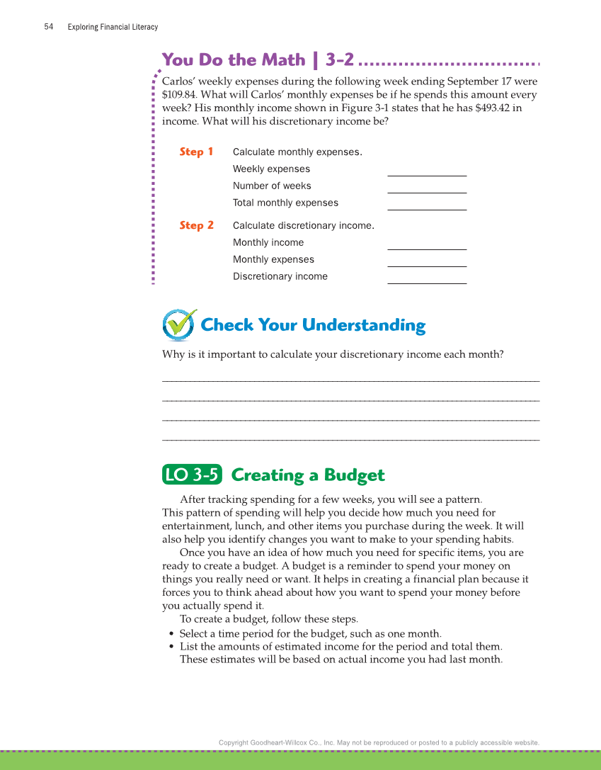 Exploring Financial Literacy 54 Copyright Goodheart-Willcox Co., Inc. May not be reproduced or posted to a publicly accessible website. Check Your Understanding Why is it important to calculate your discretionary income each month? __________________________________________________________________________________ __________________________________________________________________________________ __________________________________________________________________________________ __________________________________________________________________________________ LO 3-5 LO 3-5 Creating a Budget After tracking spending for a few weeks, you will see a pattern. This pattern of spending will help you decide how much you need for entertainment, lunch, and other items you purchase during the week. It will also help you identify changes you want to make to your spending habits. Once you have an idea of how much you need for specific items, you are ready to create a budget. A budget is a reminder to spend your money on things you really need or want. It helps in creating a financial plan because it forces you to think ahead about how you want to spend your money before you actually spend it. To create a budget, follow these steps. • Select a time period for the budget, such as one month. • List the amounts of estimated income for the period and total them. These estimates will be based on actual income you had last month. You Do the Math | 3-2 Carlos’ weekly expenses during the following week ending September 17 were $109.84. What will Carlos’ monthly expenses be if he spends this amount every week? His monthly income shown in Figure 3-1 states that he has $493.42 in income. What will his discretionary income be? Step 1 Calculate monthly expenses. Weekly expenses Number of weeks Total monthly expenses Step 2 Calculate discretionary income. Monthly income Monthly expenses Discretionary income