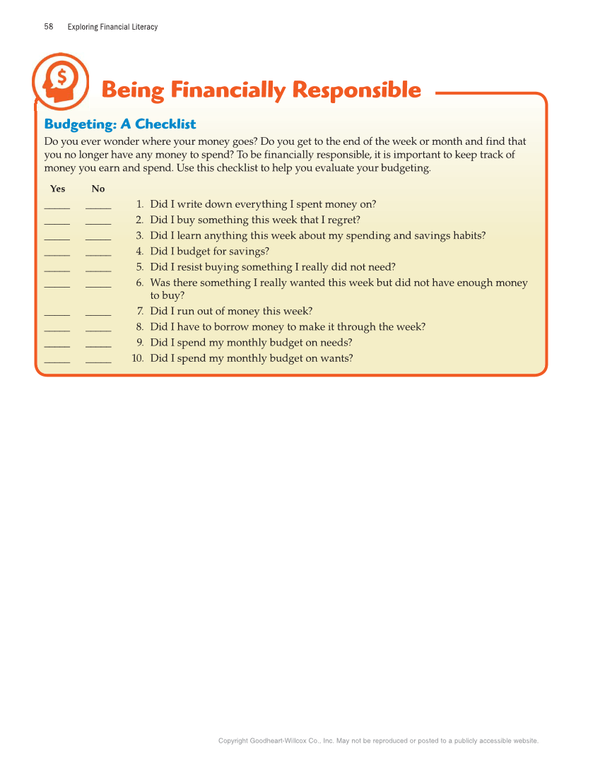 Exploring Financial Literacy 58 Copyright Goodheart-Willcox Co., Inc. May not be reproduced or posted to a publicly accessible website. Being Financially Responsible Budgeting: A Checklist Do you ever wonder where your money goes? Do you get to the end of the week or month and find that you no longer have any money to spend? To be financially responsible, it is important to keep track of money you earn and spend. Use this checklist to help you evaluate your budgeting. Yes No _____ _____ 1. Did I write down everything I spent money on? _____ _____ 2. Did I buy something this week that I regret? _____ _____ 3. Did I learn anything this week about my spending and savings habits? _____ _____ 4. Did I budget for savings? _____ _____ 5. Did I resist buying something I really did not need? _____ _____ 6. Was there something I really wanted this week but did not have enough money to buy? _____ _____ 7. Did I run out of money this week? _____ _____ 8. Did I have to borrow money to make it through the week? _____ _____ 9. Did I spend my monthly budget on needs? _____ _____ 10. Did I spend my monthly budget on wants?