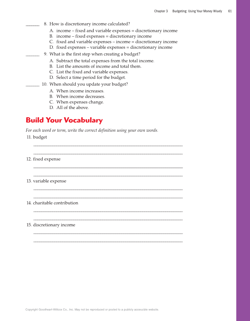 Chapter 3 Budgeting: Using Your Money Wisely 61 Copyright Goodheart-Willcox Co., Inc. May not be reproduced or posted to a publicly accessible website. _______ 8. How is discretionary income calculated? A. income – fixed and variable expenses = discretionary income B. income – fixed expenses = discretionary income C. fixed and variable expenses – income = discretionary income D. fixed expenses – variable expenses = discretionary income _______ 9. What is the fi rst step when creating a budget? A. Subtract the total expenses from the total income. B. List the amounts of income and total them. C. List the fixed and variable expenses. D. Select a time period for the budget. _______ 10. When should you update your budget? A. When income increases. B. When income decreases. C. When expenses change. D. All of the above. Build Your Vocabulary For each word or term, write the correct definition using your own words. 11. budget ______________________________________________________________________________ ______________________________________________________________________________ 12. fixed expense ______________________________________________________________________________ ______________________________________________________________________________ 13. variable expense ______________________________________________________________________________ ______________________________________________________________________________ 14. charitable contribution ______________________________________________________________________________ ______________________________________________________________________________ 15. discretionary income ______________________________________________________________________________ ______________________________________________________________________________