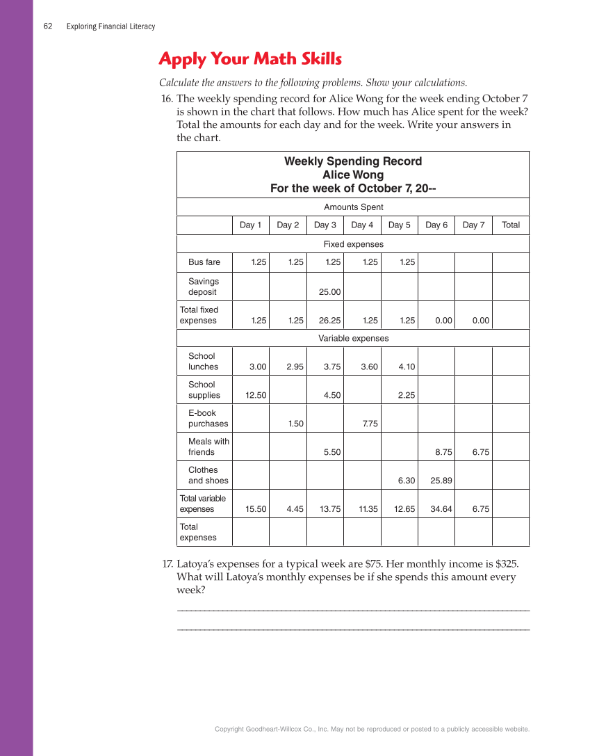 Exploring Financial Literacy 62 Copyright Goodheart-Willcox Co., Inc. May not be reproduced or posted to a publicly accessible website. Apply Your Math Skills Calculate the answers to the following problems. Show your calculations. 16. The weekly spending record for Alice Wong for the week ending October 7 is shown in the chart that follows. How much has Alice spent for the week? Total the amounts for each day and for the week. Write your answers in the chart. Weekly Spending Record Alice Wong For the week of October 7, 20-- Amounts Spent Day 1 Day 2 Day 3 Day 4 Day 5 Day 6 Day 7 Total Fixed expenses Bus fare 1.25 1.25 1.25 1.25 1.25 Savings deposit 25.00 Total fixed expenses 1.25 1.25 26.25 1.25 1.25 0.00 0.00 Variable expenses School lunches 3.00 2.95 3.75 3.60 4.10 School supplies 12.50 4.50 2.25 E-book purchases 1.50 7.75 Meals with friends 5.50 8.75 6.75 Clothes and shoes 6.30 25.89 Total variable expenses 15.50 4.45 13.75 11.35 12.65 34.64 6.75 Total expenses 17. Latoya’s expenses for a typical week are $75. Her monthly income is $325. What will Latoya’s monthly expenses be if she spends this amount every week? ______________________________________________________________________________ ______________________________________________________________________________