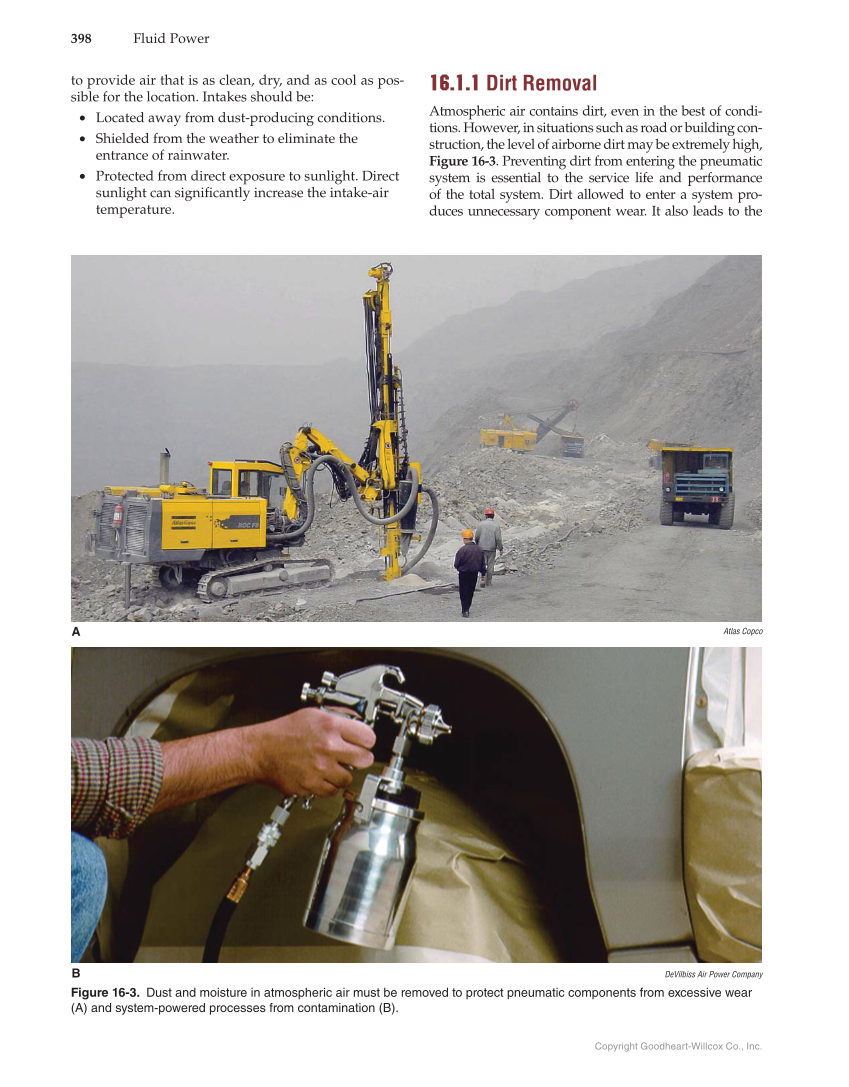 Copyright Goodheart-Willcox Co., Inc. 398 Fluid Power 16.1.1 Dirt Removal Atmospheric air contains dirt, even in the best of condi- tions. However, in situations such as road or building con- struction, the level of airborne dirt may be extremely high, Figure 16-3. Preventing dirt from entering the pneumatic system is essential to the service life and performance of the total system. Dirt allowed to enter a system pro- duces unnecessary component wear. It also leads to the to provide air that is as clean, dry, and as cool as pos- sible for the location. Intakes should be: • Located away from dust-producing conditions. • Shielded from the weather to eliminate the entrance of rainwater. • Protected from direct exposure to sunlight. Direct sunlight can signifi cantly increase the intake-air temperature. B A DeVilbiss Air Power Company Figure 16-3. Dust and moisture in atmospheric air must be removed to protect pneumatic components from excessive wear (A) and system-powered processes from contamination (B). Atlas Copco