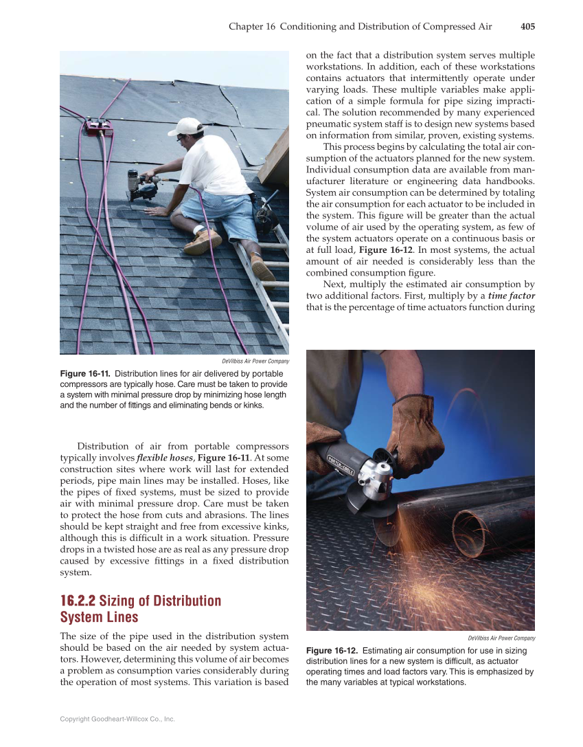 Copyright Goodheart-Willcox Co., Inc. Chapter 16 Conditioning and Distribution of Compressed Air 405 on the fact that a distribution system serves multiple workstations. In addition, each of these workstations contains actuators that intermittently operate under varying loads. These multiple variables make appli- cation of a simple formula for pipe sizing impracti- cal. The solution recommended by many experienced pneumatic system staff is to design new systems based on information from similar, proven, existing systems. This process begins by calculating the total air con- sumption of the actuators planned for the new system. Individual consumption data are available from man- ufacturer literature or engineering data handbooks. System air consumption can be determined by totaling the air consumption for each actuator to be included in the system. This fi gure will be greater than the actual volume of air used by the operating system, as few of the system actuators operate on a continuous basis or at full load, Figure 16-12. In most systems, the actual amount of air needed is considerably less than the combined consumption fi gure. Next, multiply the estimated air consumption by two additional factors. First, multiply by a time factor that is the percentage of time actuators function during Distribution of air from portable compressors typically involves fl exible hoses, Figure 16-11. At some construction sites where work will last for extended periods, pipe main lines may be installed. Hoses, like the pipes of fi xed systems, must be sized to provide air with minimal pressure drop. Care must be taken to protect the hose from cuts and abrasions. The lines should be kept straight and free from excessive kinks, although this is diffi cult in a work situation. Pressure drops in a twisted hose are as real as any pressure drop caused by excessive fi ttings in a fi xed distribution system. 16.2.2 Sizing of Distribution System Lines The size of the pipe used in the distribution system should be based on the air needed by system actua- tors. However, determining this volume of air becomes a problem as consumption varies considerably during the operation of most systems. This variation is based DeVilbiss Air Power Company Figure 16-11. Distribution lines for air delivered by portable compressors are typically hose. Care must be taken to provide a system with minimal pressure drop by minimizing hose length and the number of fittings and eliminating bends or kinks. DeVilbiss Air Power Company Figure 16-12. Estimating air consumption for use in sizing distribution lines for a new system is difficult, as actuator operating times and load factors vary. This is emphasized by the many variables at typical workstations.