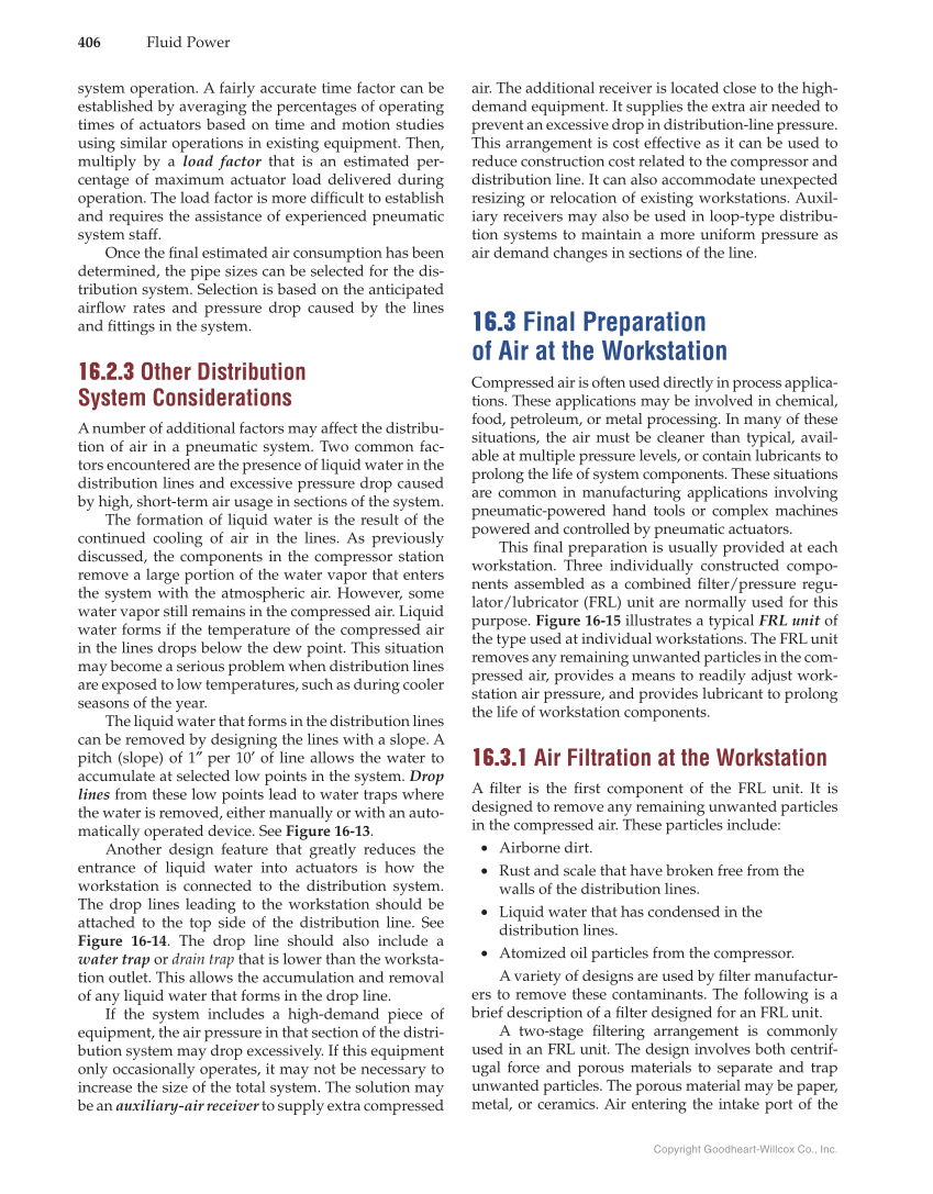 Copyright Goodheart-Willcox Co., Inc. 406 Fluid Power air. The additional receiver is located close to the high- demand equipment. It supplies the extra air needed to prevent an excessive drop in distribution-line pressure. This arrangement is cost effective as it can be used to reduce construction cost related to the compressor and distribution line. It can also accommodate unexpected resizing or relocation of existing workstations. Auxil- iary receivers may also be used in loop-type distribu- tion systems to maintain a more uniform pressure as air demand changes in sections of the line. 16.3 Final Preparation of Air at the Workstation Compressed air is often used directly in process applica- tions. These applications may be involved in chemical, food, petroleum, or metal processing. In many of these situations, the air must be cleaner than typical, avail- able at multiple pressure levels, or contain lubricants to prolong the life of system components. These situations are common in manufacturing applications involving pneumatic-powered hand tools or complex machines powered and controlled by pneumatic actuators. This fi nal preparation is usually provided at each workstation. Three individually constructed compo- nents assembled as a combined fi lter/pressure regu- lator/lubricator (FRL) unit are normally used for this purpose. Figure 16-15 illustrates a typical FRL unit of the type used at individual workstations. The FRL unit removes any remaining unwanted particles in the com- pressed air, provides a means to readily adjust work- station air pressure, and provides lubricant to prolong the life of workstation components. 16.3.1 Air Filtration at the Workstation A fi lter is the fi rst component of the FRL unit. It is designed to remove any remaining unwanted particles in the compressed air. These particles include: • Airborne dirt. • Rust and scale that have broken free from the walls of the distribution lines. • Liquid water that has condensed in the distribution lines. • Atomized oil particles from the compressor. A variety of designs are used by fi lter manufactur- ers to remove these contaminants. The following is a brief description of a fi lter designed for an FRL unit. A two-stage fi ltering arrangement is commonly used in an FRL unit. The design involves both centrif- ugal force and porous materials to separate and trap unwanted particles. The porous material may be paper, metal, or ceramics. Air entering the intake port of the system operation. A fairly accurate time factor can be established by averaging the percentages of operating times of actuators based on time and motion studies using similar operations in existing equipment. Then, multiply by a load factor that is an estimated per- centage of maximum actuator load delivered during operation. The load factor is more diffi cult to establish and requires the assistance of experienced pneumatic system staff. Once the fi nal estimated air consumption has been determined, the pipe sizes can be selected for the dis- tribution system. Selection is based on the anticipated airfl ow rates and pressure drop caused by the lines and fi ttings in the system. 16.2.3 Other Distribution System Considerations A number of additional factors may affect the distribu- tion of air in a pneumatic system. Two common fac- tors encountered are the presence of liquid water in the distribution lines and excessive pressure drop caused by high, short-term air usage in sections of the system. The formation of liquid water is the result of the continued cooling of air in the lines. As previously discussed, the components in the compressor station remove a large portion of the water vapor that enters the system with the atmospheric air. However, some water vapor still remains in the compressed air. Liquid water forms if the temperature of the compressed air in the lines drops below the dew point. This situation may become a serious problem when distribution lines are exposed to low temperatures, such as during cooler seasons of the year. The liquid water that forms in the distribution lines can be removed by designing the lines with a slope. A pitch (slope) of 1″ per 10′ of line allows the water to accumulate at selected low points in the system. Drop lines from these low points lead to water traps where the water is removed, either manually or with an auto- matically operated device. See Figure 16-13. Another design feature that greatly reduces the entrance of liquid water into actuators is how the workstation is connected to the distribution system. The drop lines leading to the workstation should be attached to the top side of the distribution line. See Figure 16-14. The drop line should also include a water trap or drain trap that is lower than the worksta- tion outlet. This allows the accumulation and removal of any liquid water that forms in the drop line. If the system includes a high-demand piece of equipment, the air pressure in that section of the distri- bution system may drop excessively. If this equipment only occasionally operates, it may not be necessary to increase the size of the total system. The solution may be an auxiliary-air receiver to supply extra compressed