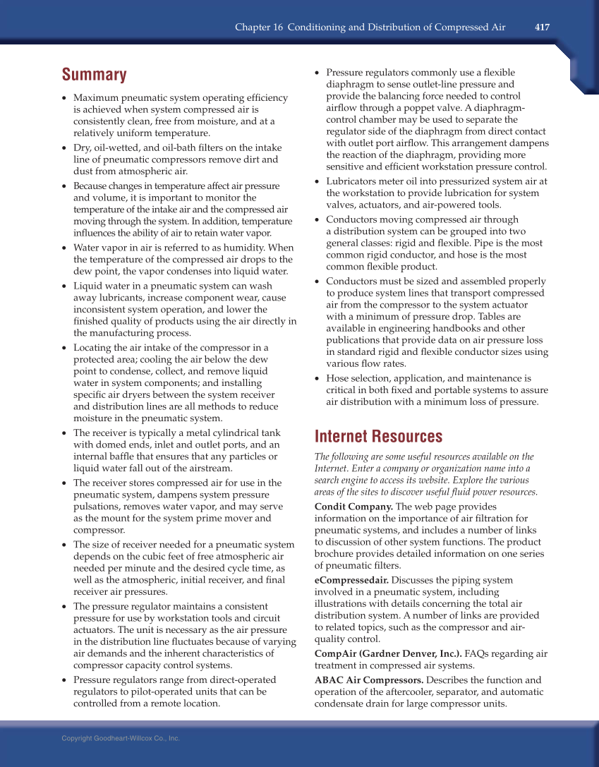 Copyright Goodheart-Willcox Co., Inc. Chapter 16 Conditioning and Distribution of Compressed Air 417 • Pressure regulators commonly use a fl exible diaphragm to sense outlet-line pressure and provide the balancing force needed to control airfl ow through a poppet valve. A diaphragm- control chamber may be used to separate the regulator side of the diaphragm from direct contact with outlet port airfl ow. This arrangement dampens the reaction of the diaphragm, providing more sensitive and effi cient workstation pressure control. • Lubricators meter oil into pressurized system air at the workstation to provide lubrication for system valves, actuators, and air-powered tools. • Conductors moving compressed air through a distribution system can be grouped into two general classes: rigid and fl exible. Pipe is the most common rigid conductor, and hose is the most common fl exible product. • Conductors must be sized and assembled properly to produce system lines that transport compressed air from the compressor to the system actuator with a minimum of pressure drop. Tables are available in engineering handbooks and other publications that provide data on air pressure loss in standard rigid and fl exible conductor sizes using various fl ow rates. • Hose selection, application, and maintenance is critical in both fi xed and portable systems to assure air distribution with a minimum loss of pressure. Internet Resources The following are some useful resources available on the Internet. Enter a company or organization name into a search engine to access its website. Explore the various areas of the sites to discover useful fl uid power resources. Condit Company. The web page provides information on the importance of air fi ltration for pneumatic systems, and includes a number of links to discussion of other system functions. The product brochure provides detailed information on one series of pneumatic fi lters. eCompressedair. Discusses the piping system involved in a pneumatic system, including illustrations with details concerning the total air distribution system. A number of links are provided to related topics, such as the compressor and air- quality control. CompAir (Gardner Denver, Inc.). FAQs regarding air treatment in compressed air systems. ABAC Air Compressors. Describes the function and operation of the aftercooler, separator, and automatic condensate drain for large compressor units. Summary • Maximum pneumatic system operating effi ciency is achieved when system compressed air is consistently clean, free from moisture, and at a relatively uniform temperature. • Dry, oil-wetted, and oil-bath fi lters on the intake line of pneumatic compressors remove dirt and dust from atmospheric air. • Because changes in temperature affect air pressure and volume, it is important to monitor the temperature of the intake air and the compressed air moving through the system. In addition, temperature infl uences the ability of air to retain water vapor. • Water vapor in air is referred to as humidity. When the temperature of the compressed air drops to the dew point, the vapor condenses into liquid water. • Liquid water in a pneumatic system can wash away lubricants, increase component wear, cause inconsistent system operation, and lower the fi nished quality of products using the air directly in the manufacturing process. • Locating the air intake of the compressor in a protected area cooling the air below the dew point to condense, collect, and remove liquid water in system components and installing specifi c air dryers between the system receiver and distribution lines are all methods to reduce moisture in the pneumatic system. • The receiver is typically a metal cylindrical tank with domed ends, inlet and outlet ports, and an internal baffl e that ensures that any particles or liquid water fall out of the airstream. • The receiver stores compressed air for use in the pneumatic system, dampens system pressure pulsations, removes water vapor, and may serve as the mount for the system prime mover and compressor. • The size of receiver needed for a pneumatic system depends on the cubic feet of free atmospheric air needed per minute and the desired cycle time, as well as the atmospheric, initial receiver, and fi nal receiver air pressures. • The pressure regulator maintains a consistent pressure for use by workstation tools and circuit actuators. The unit is necessary as the air pressure in the distribution line fl uctuates because of varying air demands and the inherent characteristics of compressor capacity control systems. • Pressure regulators range from direct-operated regulators to pilot-operated units that can be controlled from a remote location.