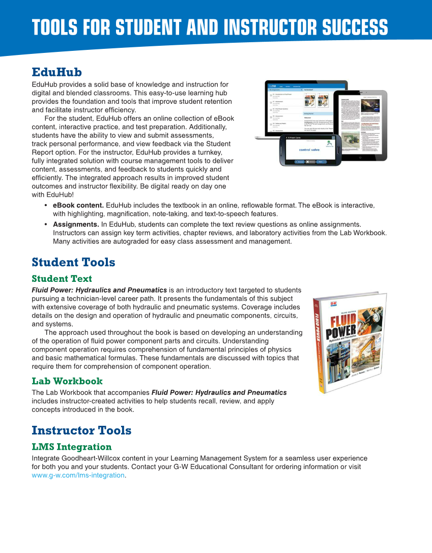 TOOLS FOR STUDENT AND INSTRUCTOR SUCCESS EduHub EduHub provides a solid base of knowledge and instruction for digital and blended classrooms. This easy-to-use learning hub provides the foundation and tools that improve student retention and facilitate instructor efficiency. For the student, EduHub offers an online collection of eBook content, interactive practice, and test preparation. Additionally, students have the ability to view and submit assessments, track personal performance, and view feedback via the Student Report option. For the instructor, EduHub provides a turnkey, fully integrated solution with course management tools to deliver content, assessments, and feedback to students quickly and efficiently. The integrated approach results in improved student outcomes and instructor flexibility. Be digital ready on day one with EduHub! • eBook content. EduHub includes the textbook in an online, reflowable format. The eBook is interactive, with highlighting, magnification, note-taking, and text-to-speech features. • Assignments. In EduHub, students can complete the text review questions as online assignments. Instructors can assign key term activities, chapter reviews, and laboratory activities from the Lab Workbook. Many activities are autograded for easy class assessment and management. Student Tools Student Text Fluid Power: Hydraulics and Pneumatics is an introductory text targeted to students pursuing a technician-level career path. It presents the fundamentals of this subject with extensive coverage of both hydraulic and pneumatic systems. Coverage includes details on the design and operation of hydraulic and pneumatic components, circuits, and systems. The approach used throughout the book is based on developing an understanding of the operation of fluid power component parts and circuits. Understanding component operation requires comprehension of fundamental principles of physics and basic mathematical formulas. These fundamentals are discussed with topics that require them for comprehension of component operation. Lab Workbook The Lab Workbook that accompanies Fluid Power: Hydraulics and Pneumatics includes instructor-created activities to help students recall, review, and apply concepts introduced in the book. Instructor Tools LMS Integration Integrate Goodheart-Willcox content in your Learning Management System for a seamless user experience for both you and your students. Contact your G-W Educational Consultant for ordering information or visit www.g-w.com/lms-integration.