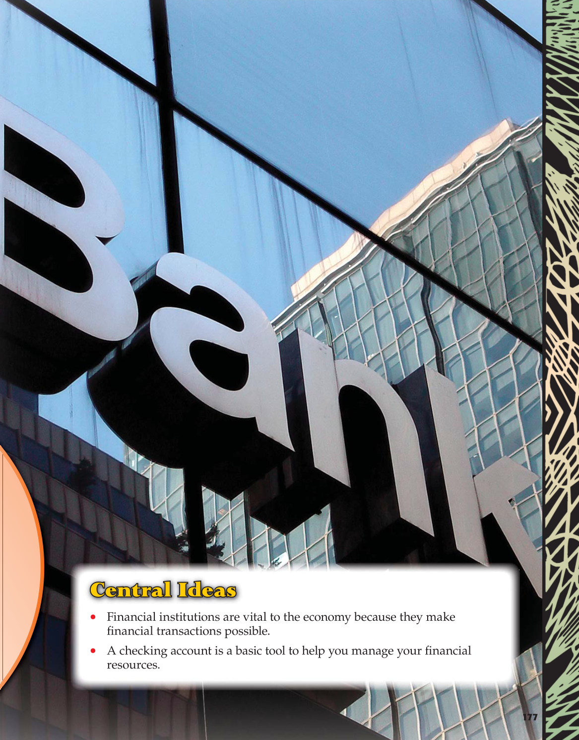 177 Central Ideas Central Ideas • Financial institutions are vital to the economy because they make fi nancial transactions possible. • A checking account is a basic tool to help you manage your fi nancial resources.