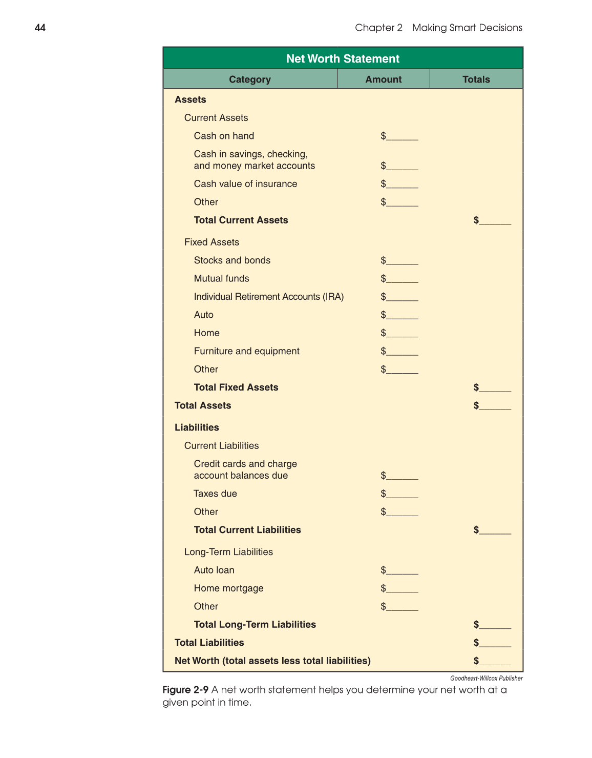 Figure 2-9 A net worth statement helps you determine your net worth at a