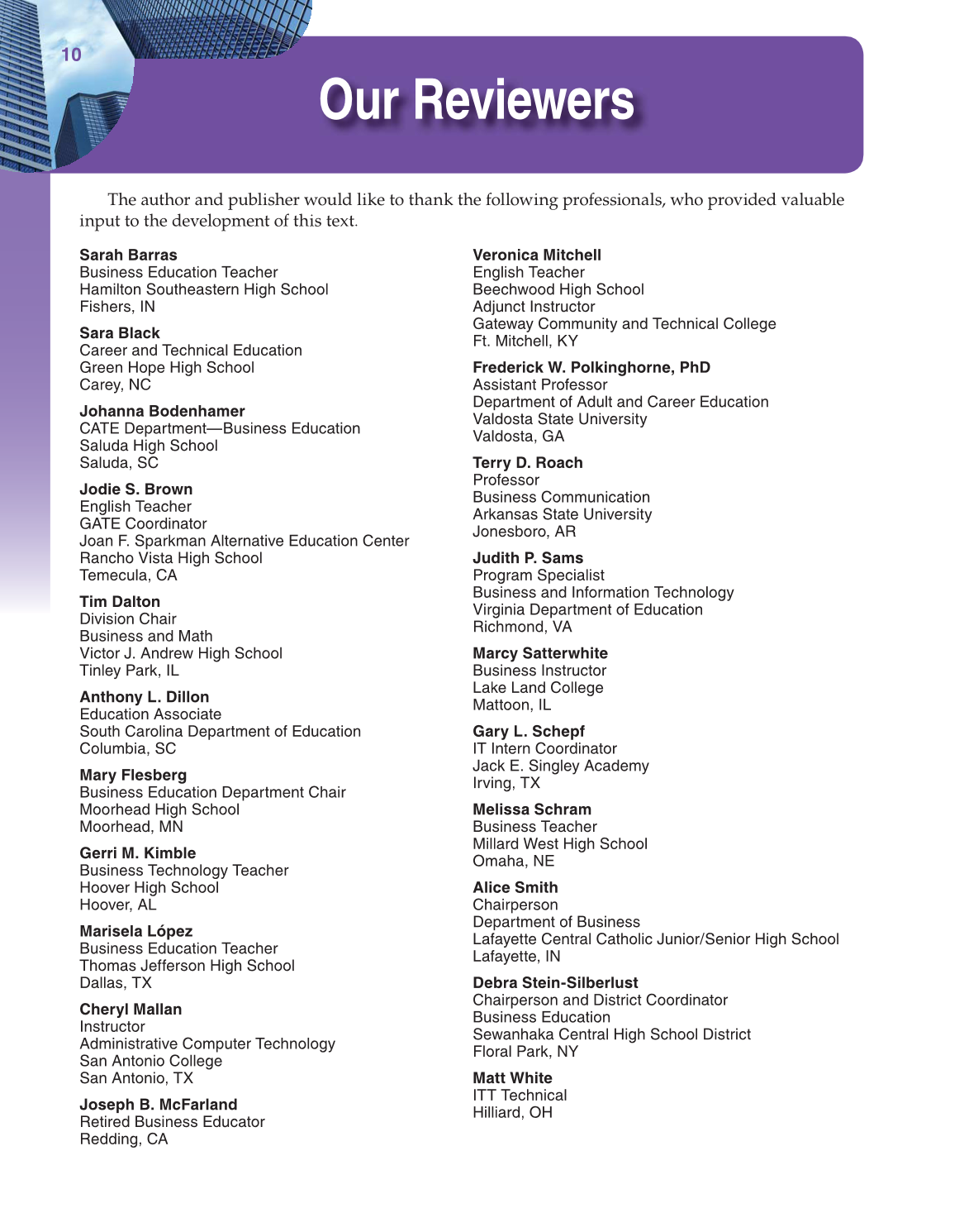 The author and publisher would like to thank the following professionals, who provided valuable
