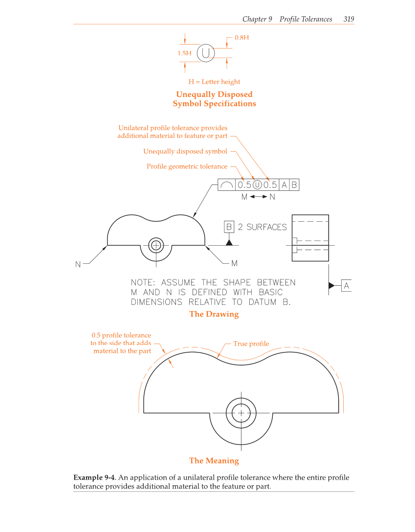 Chapter 9 Profile Tolerances 319 Unequally Disposed Symbol Specifications The Drawing The Meaning H = Letter height 1.5H 0.8H Unilateral profile tolerance provides additional material to feature or part Unequally disposed symbol Profile geometric tolerance 0.5 profile tolerance to the side that adds material to the part True profile Example 9-4. An application of a unilateral profi le tolerance where the entire profi le tolerance provides additional material to the feature or part.