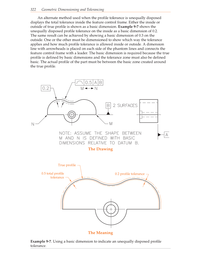 322 Geometric Dimensioning and Tolerancing An alternate method used when the profile tolerance is unequally disposed displays the total tolerance inside the feature control frame. Either the inside or outside of true profile is shown as a basic dimension. Example 9-7 shows the unequally disposed profile tolerance on the inside as a basic dimension of 0.2. The same result can be achieved by showing a basic dimension of 0.3 on the outside. One or the other must be dimensioned to show which way the tolerance applies and how much profile tolerance is allowed inside or outside. A dimension line with arrowheads is placed on each side of the phantom lines and connects the feature control frame with a leader. The basic dimension is required because the true profile is defined by basic dimensions and the tolerance zone must also be defined basic. The actual profile of the part must be between the basic zone created around the true profile. The Drawing The Meaning 0.2 profile tolerance True profile 0.5 total profile tolerance Example 9-7. Using a basic dimension to indicate an unequally disposed profi le tolerance.