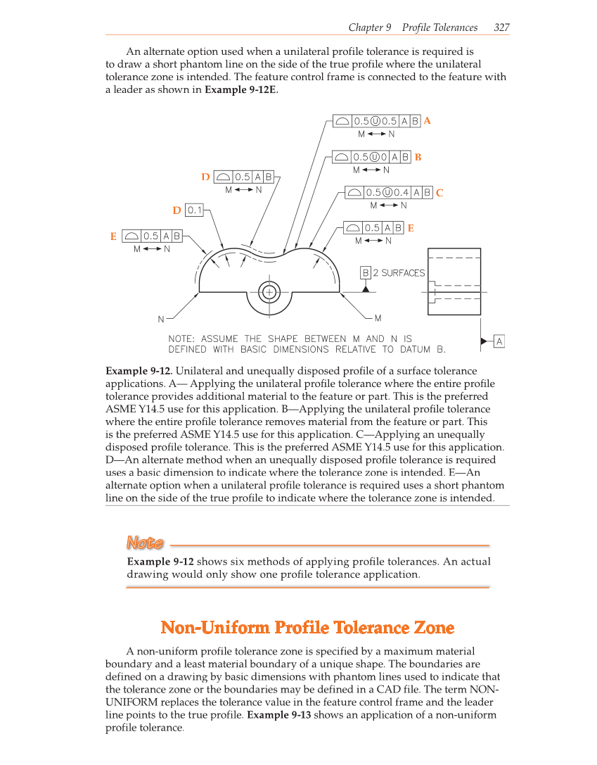 Chapter 9 Profile Tolerances 327 A B C E E D D Example 9-12. Unilateral and unequally disposed profi le of a surface tolerance applications. A— Applying the unilateral profi le tolerance where the entire profi le tolerance provides additional material to the feature or part. This is the preferred ASME Y14.5 use for this application. B—Applying the unilateral profi le tolerance where the entire profi le tolerance removes material from the feature or part. This is the preferred ASME Y14.5 use for this application. C—Applying an unequally disposed profi le tolerance. This is the preferred ASME Y14.5 use for this application. D—An alternate method when an unequally disposed profi le tolerance is required uses a basic dimension to indicate where the tolerance zone is intended. E—An alternate option when a unilateral profi le tolerance is required uses a short phantom line on the side of the true profi le to indicate where the tolerance zone is intended. An alternate option used when a unilateral profile tolerance is required is to draw a short phantom line on the side of the true profile where the unilateral tolerance zone is intended. The feature control frame is connected to the feature with a leader as shown in Example 9-12E. Note Example 9-12 shows six methods of applying profi le tolerances. An actual drawing would only show one profi le tolerance application. Non-Uniform Profile Tolerance Zone A non-uniform profile tolerance zone is specified by a maximum material boundary and a least material boundary of a unique shape. The boundaries are defined on a drawing by basic dimensions with phantom lines used to indicate that the tolerance zone or the boundaries may be defined in a CAD file. The term NON- UNIFORM replaces the tolerance value in the feature control frame and the leader line points to the true profile. Example 9-13 shows an application of a non-uniform profile tolerance.