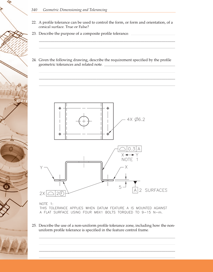 340 Geometric Dimensioning and Tolerancing 22. A profi le tolerance can be used to control the form, or form and orientation, of a conical surface. True or False? 23. Describe the purpose of a composite profi le tolerance. _______________________ _______________________________________________________________________ _______________________________________________________________________ _______________________________________________________________________ 24. Given the following drawing, describe the requirement specifi ed by the profi le geometric tolerances and related note. _____________________________________ _______________________________________________________________________ _______________________________________________________________________ _______________________________________________________________________ _______________________________________________________________________ 25. Describe the use of a non-uniform profi le tolerance zone, including how the non- uniform profi le tolerance is specifi ed in the feature control frame. _______________________________________________________________________ _______________________________________________________________________ _______________________________________________________________________ _______________________________________________________________________