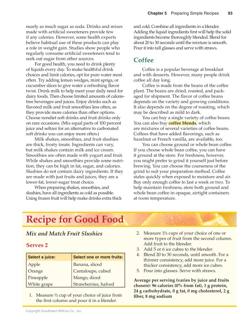 Chapter 5 Preparing Simple Recipes 93 Copyright Goodheart-Willcox Co., Inc. nearly as much sugar as soda. Drinks and mixes made with artifi cial sweeteners provide few if any calories. However, some health experts believe habitual use of these products can play a role in weight gain. Studies show people who regularly consume artifi cial sweeteners tend to seek out sugar from other sources. For good health, you need to drink plenty of liquids every day. To make healthful drink choices and limit calories, opt for pure water most often. Try adding lemon wedges, mint sprigs, or cucumber slices to give water a refreshing fl avor twist. Drink milk to help meet your daily need for dairy foods. Then choose limited amounts of calorie- free beverages and juices. Enjoy drinks such as fl avored milk and fruit smoothies less often, as they provide more calories than other options. Choose nondiet soft drinks and fruit drinks only on rare occasions. (Mix equal parts of 100 percent juice and seltzer for an alternative to carbonated soft drinks you can enjoy more often.) Milk shakes, smoothies, and fruit slushies are thick, frosty treats. Ingredients can vary, but milk shakes contain milk and ice cream. Smoothies are often made with yogurt and fruit. While shakes and smoothies provide some nutri- tion, they can be high in fat, sugar, and calories. Slushies do not contain dairy ingredients. If they are made with just fruits and juices, they are a lower-fat, lower-sugar treat choice. When preparing shakes, smoothies, and slushies, have all ingredients as cold as possible. Using frozen fruit will help make drinks extra thick and cold. Combine all ingredients in a blender. Adding the liquid ingredients fi rst will help the solid ingredients become thoroughly blended. Blend for about 20 to 30 seconds until the mixture is smooth. Pour it into tall glasses and serve with straws. Coffee Coffee is a popular beverage at breakfast and with desserts. However, many people drink coffee all day long. Coffee is made from the beans of the coffee plant. The beans are dried, roasted, and pack- aged for shipment. The fl avor of coffee beans depends on the variety and growing conditions. It also depends on the degree of roasting, which may be described as mild to dark. You can buy a single variety of coffee beans. You can also buy coffee blends, which are mixtures of several varieties of coffee beans. Coffees that have added fl avorings, such as hazelnut or French vanilla, are available, too. You can choose ground or whole bean coffee. If you choose whole bean coffee, you can have it ground at the store. For freshness, however, you might prefer to grind it yourself just before brewing. You can choose the coarseness of the grind to suit your preparation method. Coffee stales quickly when exposed to moisture and air. Buy only enough coffee to last a week or two. To help maintain freshness, store both ground and whole bean coffee in opaque, airtight containers at room temperature. Recipe for Good Food Mix and Match Fruit Slushies Serves 2 Select a juice: Select one or more fruits: Apple Banana, sliced Orange Cantaloupe, cubed Pineapple Mango, diced White grape Strawberries, halved 1. Measure ½ cup of your choice of juice from the fi rst column and pour it in a blender. 2. Measure 1½ cups of your choice of one or more types of fruit from the second column. Add fruit to the blender. 3. Add 5 or 6 ice cubes to the blender. 4. Blend 20 to 30 seconds, until smooth. For a thinner consistency, add more juice. For a thicker consistency, add more ice cubes. 5. Pour into glasses. Serve with straws. Average per serving (varies by juice and fruits chosen): 96 calories (0% from fat), 1 g protein, 24 g carbohydrate, 0 g fat, 0 mg cholesterol, 2 g fi ber, 8 mg sodium