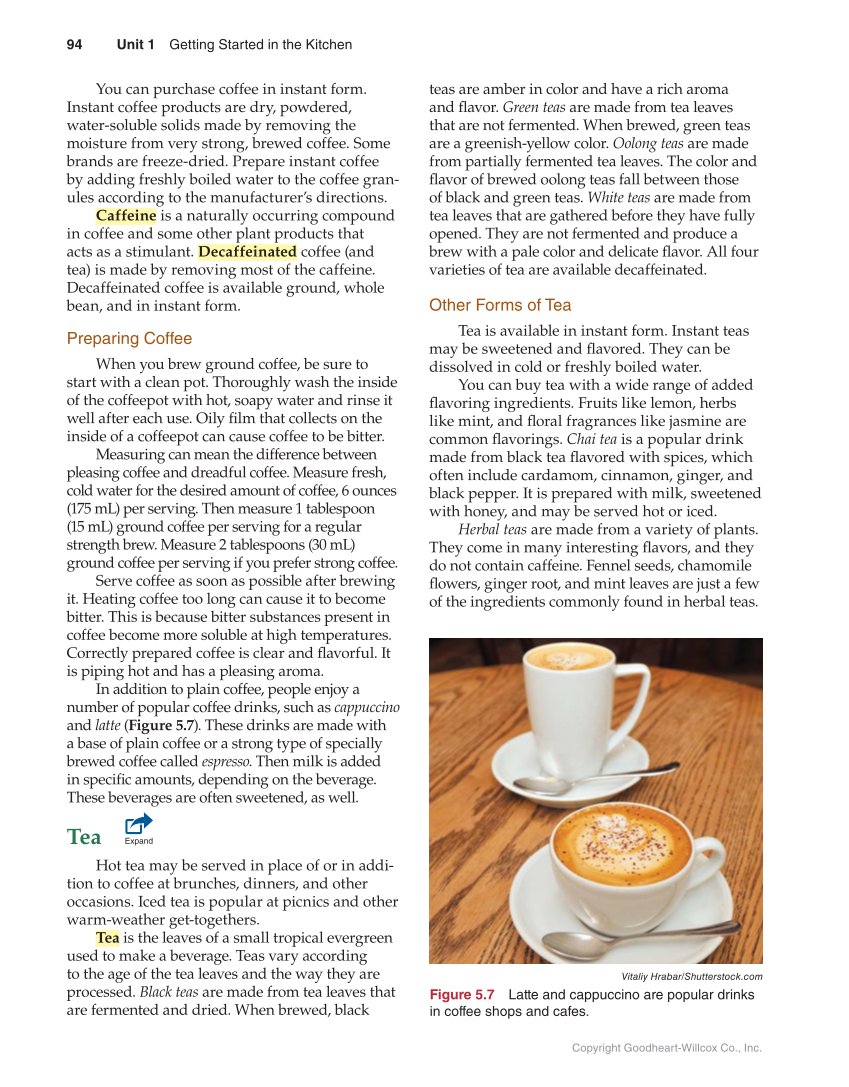 94 Unit 1 Getting Started in the Kitchen Copyright Goodheart-Willcox Co., Inc. You can purchase coffee in instant form. Instant coffee products are dry, powdered, water-soluble solids made by removing the moisture from very strong, brewed coffee. Some brands are freeze-dried. Prepare instant coffee by adding freshly boiled water to the coffee gran- ules according to the manufacturer’s directions. Caffeine is a naturally occurring compound in coffee and some other plant products that acts as a stimulant. Decaffeinated coffee (and tea) is made by removing most of the caffeine. Decaffeinated coffee is available ground, whole bean, and in instant form. Preparing Coffee When you brew ground coffee, be sure to start with a clean pot. Thoroughly wash the inside of the coffeepot with hot, soapy water and rinse it well after each use. Oily fi lm that collects on the inside of a coffeepot can cause coffee to be bitter. Measuring can mean the difference between pleasing coffee and dreadful coffee. Measure fresh, cold water for the desired amount of coffee, 6 ounces (175 mL) per serving. Then measure 1 tablespoon (15 mL) ground coffee per serving for a regular strength brew. Measure 2 tablespoons (30 mL) ground coffee per serving if you prefer strong coffee. Serve coffee as soon as possible after brewing it. Heating coffee too long can cause it to become bitter. This is because bitter substances present in coffee become more soluble at high temperatures. Correctly prepared coffee is clear and fl avorful. It is piping hot and has a pleasing aroma. In addition to plain coffee, people enjoy a number of popular coffee drinks, such as cappuccino and latte (Figure 5.7). These drinks are made with a base of plain coffee or a strong type of specially brewed coffee called espresso. Then milk is added in specifi c amounts, depending on the beverage. These beverages are often sweetened, as well. Tea Expand Hot tea may be served in place of or in addi- tion to coffee at brunches, dinners, and other occasions. Iced tea is popular at picnics and other warm-weather get-togethers. Tea is the leaves of a small tropical evergreen used to make a beverage. Teas vary according to the age of the tea leaves and the way they are processed. Black teas are made from tea leaves that are fermented and dried. When brewed, black teas are amber in color and have a rich aroma and fl avor. Green teas are made from tea leaves that are not fermented. When brewed, green teas are a greenish-yellow color. Oolong teas are made from partially fermented tea leaves. The color and fl avor of brewed oolong teas fall between those of black and green teas. White teas are made from tea leaves that are gathered before they have fully opened. They are not fermented and produce a brew with a pale color and delicate fl avor. All four varieties of tea are available decaffeinated. Other Forms of Tea Tea is available in instant form. Instant teas may be sweetened and fl avored. They can be dissolved in cold or freshly boiled water. You can buy tea with a wide range of added fl avoring ingredients. Fruits like lemon, herbs like mint, and fl oral fragrances like jasmine are common fl avorings. Chai tea is a popular drink made from black tea fl avored with spices, which often include cardamom, cinnamon, ginger, and black pepper. It is prepared with milk, sweetened with honey, and may be served hot or iced. Herbal teas are made from a variety of plants. They come in many interesting fl avors, and they do not contain caffeine. Fennel seeds, chamomile fl owers, ginger root, and mint leaves are just a few of the ingredients commonly found in herbal teas. Vitaliy Hrabar/Shutterstock.com Figure 5.7 Latte and cappuccino are popular drinks in coffee shops and cafes.