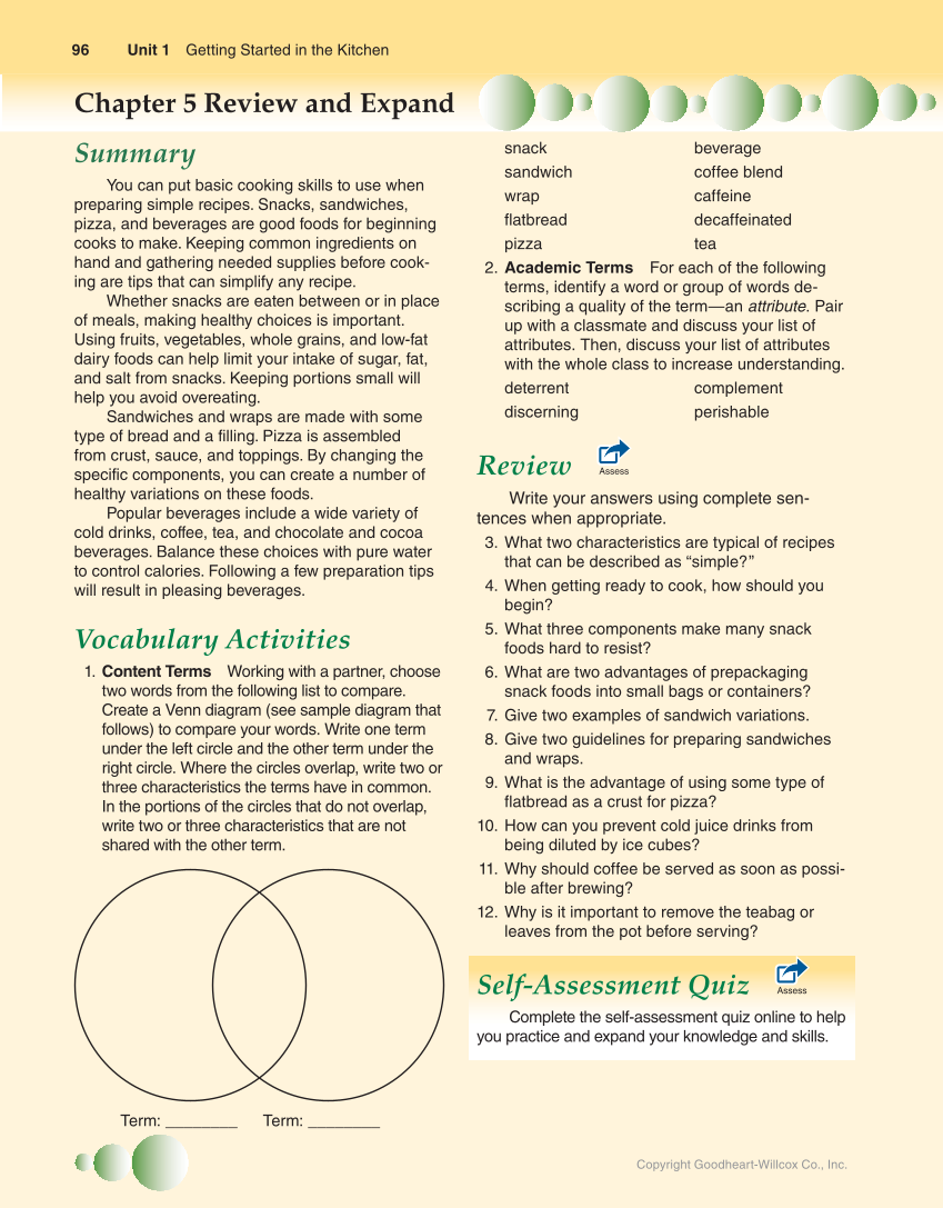 96 Unit 1 Getting Started in the Kitchen Copyright Goodheart-Willcox Co., Inc. Chapter 5 Review and Expand Summary You can put basic cooking skills to use when preparing simple recipes. Snacks, sandwiches, pizza, and beverages are good foods for beginning cooks to make. Keeping common ingredients on hand and gathering needed supplies before cook- ing are tips that can simplify any recipe. Whether snacks are eaten between or in place of meals, making healthy choices is important. Using fruits, vegetables, whole grains, and low-fat dairy foods can help limit your intake of sugar, fat, and salt from snacks. Keeping portions small will help you avoid overeating. Sandwiches and wraps are made with some type of bread and a filling. Pizza is assembled from crust, sauce, and toppings. By changing the specific components, you can create a number of healthy variations on these foods. Popular beverages include a wide variety of cold drinks, coffee, tea, and chocolate and cocoa beverages. Balance these choices with pure water to control calories. Following a few preparation tips will result in pleasing beverages. Vocabulary Activities 1. Content Terms Working with a partner, choose two words from the following list to compare. Create a Venn diagram (see sample diagram that follows) to compare your words. Write one term under the left circle and the other term under the right circle. Where the circles overlap, write two or three characteristics the terms have in common. In the portions of the circles that do not overlap, write two or three characteristics that are not shared with the other term. snack sandwich wrap flatbread pizza beverage coffee blend caffeine decaffeinated tea 2. Academic Terms For each of the following terms, identify a word or group of words de- scribing a quality of the term—an attribute. Pair up with a classmate and discuss your list of attributes. Then, discuss your list of attributes with the whole class to increase understanding. deterrent discerning complement perishable Review Assess Write your answers using complete sen- tences when appropriate. 3. What two characteristics are typical of recipes that can be described as “simple?” 4. When getting ready to cook, how should you begin? 5. What three components make many snack foods hard to resist? 6. What are two advantages of prepackaging snack foods into small bags or containers? 7. Give two examples of sandwich variations. 8. Give two guidelines for preparing sandwiches and wraps. 9. What is the advantage of using some type of fl atbread as a crust for pizza? 10. How can you prevent cold juice drinks from being diluted by ice cubes? 11. Why should coffee be served as soon as possi- ble after brewing? 12. Why is it important to remove the teabag or leaves from the pot before serving? Self-Assessment Quiz Assess Complete the self-assessment quiz online to help you practice and expand your knowledge and skills. Term: ________ Term: ________