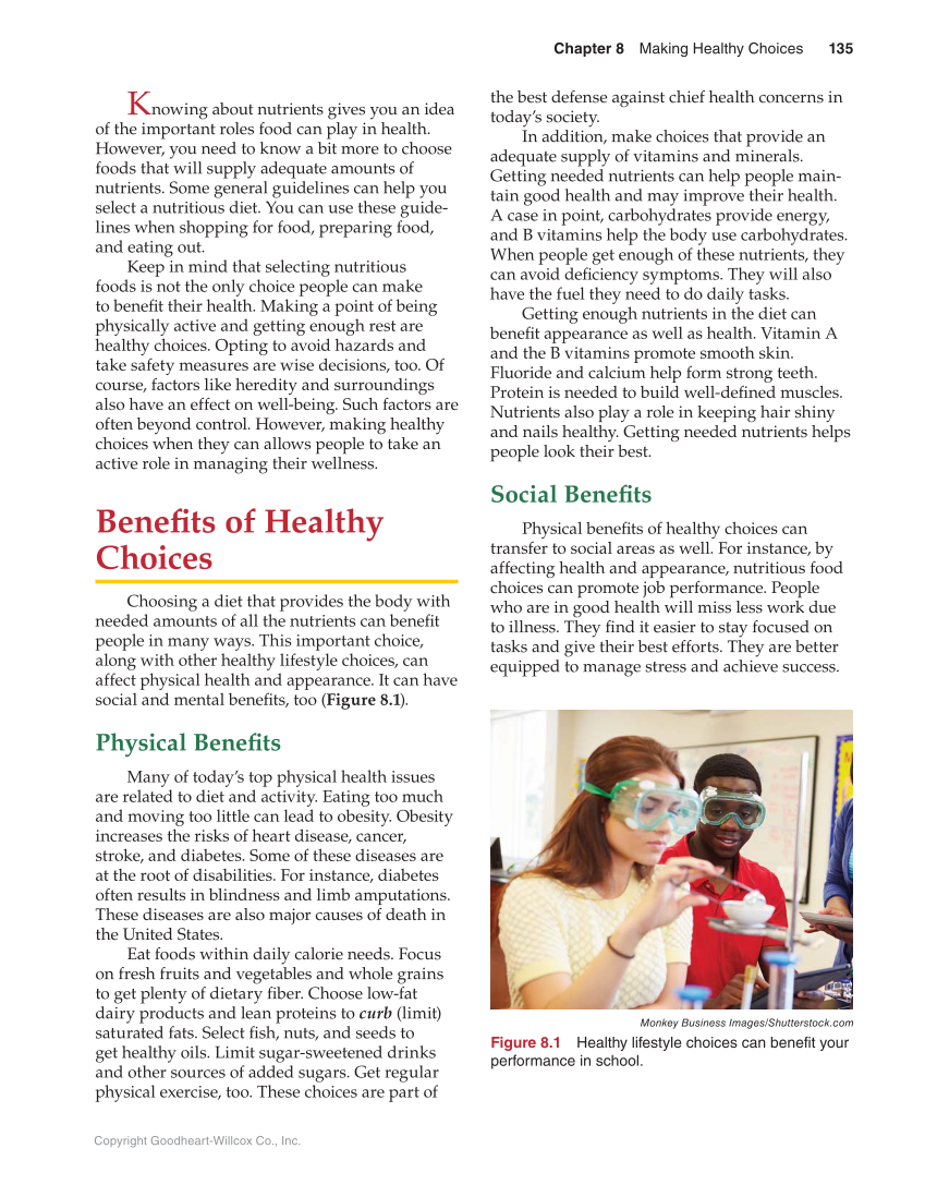Chapter 8 Making Healthy Choices 135 Copyright Goodheart-Willcox Co., Inc. Knowing about nutrients gives you an idea of the important roles food can play in health. However, you need to know a bit more to choose foods that will supply adequate amounts of nutrients. Some general guidelines can help you select a nutritious diet. You can use these guide- lines when shopping for food, preparing food, and eating out. Keep in mind that selecting nutritious foods is not the only choice people can make to benefi t their health. Making a point of being physically active and getting enough rest are healthy choices. Opting to avoid hazards and take safety measures are wise decisions, too. Of course, factors like heredity and surroundings also have an effect on well-being. Such factors are often beyond control. However, making healthy choices when they can allows people to take an active role in managing their wellness. Benefi ts of Healthy Choices Choosing a diet that provides the body with needed amounts of all the nutrients can benefi t people in many ways. This important choice, along with other healthy lifestyle choices, can affect physical health and appearance. It can have social and mental benefi ts, too (Figure 8.1). Physical Benefi ts Many of today’s top physical health issues are related to diet and activity. Eating too much and moving too little can lead to obesity. Obesity increases the risks of heart disease, cancer, stroke, and diabetes. Some of these diseases are at the root of disabilities. For instance, diabetes often results in blindness and limb amputations. These diseases are also major causes of death in the United States. Eat foods within daily calorie needs. Focus on fresh fruits and vegetables and whole grains to get plenty of dietary fi ber. Choose low-fat dairy products and lean proteins to curb (limit) saturated fats. Select fi sh, nuts, and seeds to get healthy oils. Limit sugar-sweetened drinks and other sources of added sugars. Get regular physical exercise, too. These choices are part of the best defense against chief health concerns in today’s society. In addition, make choices that provide an adequate supply of vitamins and minerals. Getting needed nutrients can help people main- tain good health and may improve their health. A case in point, carbohydrates provide energy, and B vitamins help the body use carbohydrates. When people get enough of these nutrients, they can avoid defi ciency symptoms. They will also have the fuel they need to do daily tasks. Getting enough nutrients in the diet can benefi t appearance as well as health. Vitamin A and the B vitamins promote smooth skin. Fluoride and calcium help form strong teeth. Protein is needed to build well-defi ned muscles. Nutrients also play a role in keeping hair shiny and nails healthy. Getting needed nutrients helps people look their best. Social Benefi ts Physical benefi ts of healthy choices can transfer to social areas as well. For instance, by affecting health and appearance, nutritious food choices can promote job performance. People who are in good health will miss less work due to illness. They fi nd it easier to stay focused on tasks and give their best efforts. They are better equipped to manage stress and achieve success. Monkey Business Images/Shutterstock.com Figure 8.1 Healthy lifestyle choices can benefit your performance in school.