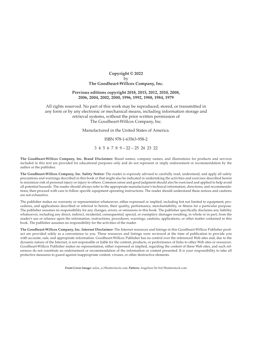 Copyright © 2022 by The Goodheart-Willcox Company, Inc. Previous editions copyright 2018, 2015, 2012, 2010, 2008, 2006, 2004, 2002, 2000, 1996, 1992, 1988, 1984, 1979 All rights reserved. No part of this work may be reproduced, stored, or transmitted in any form or by any electronic or mechanical means, including information storage and retrieval systems, without the prior written permission of The Goodheart-Willcox Company, Inc. Manufactured in the United States of America. ISBN 978-1-63563-958-2 3 4 5 6 7 8 9 – 22 – 25 24 23 22 The Goodheart-Willcox Company, Inc. Brand Disclaimer: Brand names, company names, and illustrations for products and services included in this text are provided for educational purposes only and do not represent or imply endorsement or recommendation by the author or the publisher. The Goodheart-Willcox Company, Inc. Safety Notice: The reader is expressly advised to carefully read, understand, and apply all safety precautions and warnings described in this book or that might also be indicated in undertaking the activities and exercises described herein to minimize risk of personal injury or injury to others. Common sense and good judgment should also be exercised and applied to help avoid all potential hazards. The reader should always refer to the appropriate manufacturer’s technical information, directions, and recommenda- tions then proceed with care to follow specific equipment operating instructions. The reader should understand these notices and cautions are not exhaustive. The publisher makes no warranty or representation whatsoever, either expressed or implied, including but not limited to equipment, pro- cedures, and applications described or referred to herein, their quality, performance, merchantability, or fitness for a particular purpose. The publisher assumes no responsibility for any changes, errors, or omissions in this book. The publisher specifically disclaims any liability whatsoever, including any direct, indirect, incidental, consequential, special, or exemplary damages resulting, in whole or in part, from the reader’s use or reliance upon the information, instructions, procedures, warnings, cautions, applications, or other matter contained in this book. The publisher assumes no responsibility for the activities of the reader. The Goodheart-Willcox Company, Inc. Internet Disclaimer: The Internet resources and listings in this Goodheart-Willcox Publisher prod- uct are provided solely as a convenience to you. These resources and listings were reviewed at the time of publication to provide you with accurate, safe, and appropriate information. Goodheart-Willcox Publisher has no control over the referenced Web sites and, due to the dynamic nature of the Internet, is not responsible or liable for the content, products, or performance of links to other Web sites or resources. Goodheart-Willcox Publisher makes no representation, either expressed or implied, regarding the content of these Web sites, and such ref- erences do not constitute an endorsement or recommendation of the information or content presented. It is your responsibility to take all protective measures to guard against inappropriate content, viruses, or other destructive elements. Front Cover Image: iuliia_n/Shutterstock.com Pattern: Angelina De Sol/Shutterstock.com