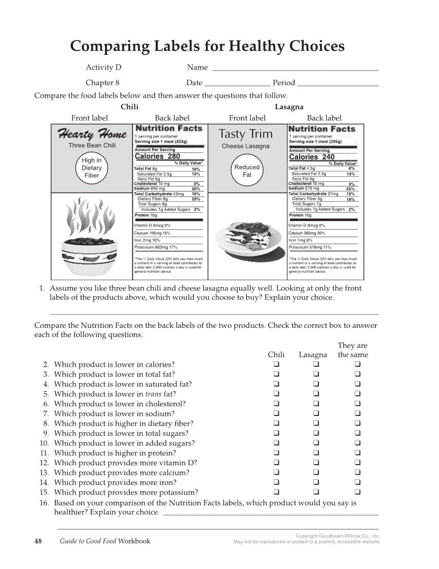 Copyright Goodheart-Willcox Co., Inc. May not be reproduced or posted to a publicly accessible website. 48 Guide to Good Food Workbook Activity D Name ____________________________________________ Chapter 8 Date__________________ Period______________________ Comparing Labels for Healthy Choices Compare the food labels below and then answer the questions that follow. Chili Lasagna Front label Back label Front label Back label 1. Assume you like three bean chili and cheese lasagna equally well. Looking at only the front labels of the products above, which would you choose to buy? Explain your choice. _ ____________________________________________________________________________________ Compare the Nutrition Facts on the back labels of the two products. Check the correct box to answer each of the following questions. Chili Lasagna They are the same 2. Which product is lower in calories? ❑ ❑ ❑ 3. Which product is lower in total fat? ❑ ❑ ❑ 4. Which product is lower in saturated fat? ❑ ❑ ❑ 5. Which product is lower in trans fat? ❑ ❑ ❑ 6. Which product is lower in cholesterol? ❑ ❑ ❑ 7. Which product is lower in sodium? ❑ ❑ ❑ 8. Which product is higher in dietary fiber? ❑ ❑ ❑ 9. Which product is lower in total sugars? ❑ ❑ ❑ 10. Which product is lower in added sugars? ❑ ❑ ❑ 11. Which product is higher in protein? ❑ ❑ ❑ 12. Which product provides more vitamin D? ❑ ❑ ❑ 13. Which product provides more calcium? ❑ ❑ ❑ 14. Which product provides more iron? ❑ ❑ ❑ 15. Which product provides more potassium? ❑ ❑ ❑ 16. Based on your comparison of the Nutrition Facts labels, which product would you say is healthier? Explain your choice._ _______________________________________________________ _ __________________________________________________________________________________ High in Dietary Fiber Reduced Fat Tasty Trim Cheese Lasagna Hearty Home Three Bean Chili 5570 1 serving per container Serving size 1 meal (323g) Amount Per Serving Calories 280 Total Fat 8g 10% % Daily Value* Saturated Fat 2.5g 13% Trans Fat 0g Cholesterol 10 mg 3% Sodium 690 mg 30% Total Carbohydrate 43mg 16% Dietary Fiber 8g 29% Total Sugars 8g Includes 1g Added Sugars 2% Protein 10g *The % Daily Value (DV) tells you how much a nutrient in a serving of food contributes to a daily diet. 2,000 calories a day is used for general nutrition advice. Calcium 195mg 15% Vitamin D 0mcg 0% Potassium 803mg 17% Iron 2mg 10% 1 serving per container Serving size 1 meal (295g) Amount Per Serving Calories 240 Total Fat 4.5g % Daily Value* Saturated Fat 2.5g Trans Fat 0g Cholesterol 10 mg Sodium mg Total Carbohydrate 37mg Dietary Fiber 5g Total Sugars 7g Includes 1g Added Sugars Protein 10g *The % Daily Value (DV) tells you how much a nutrient in a serving of food contributes to a daily diet. 2,000 calories a day is used for general nutrition advice. Calcium 260mg 20% Vitamin D 0mcg 0% Potassium 518mg 11% Iron 1mg 6% 6% 13% 3% 25%4 13% 18% 2%