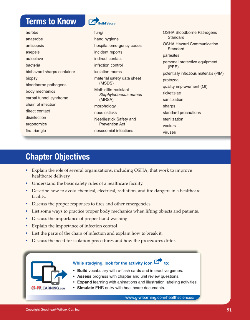 Terms to Know aerobe anaerobe antisepsis asepsis autoclave bacteria biohazard sharps container biopsy bloodborne pathogens body mechanics carpal tunnel syndrome chain of infection direct contact disinfection ergonomics fire triangle fungi hand hygiene hospital emergency codes incident reports indirect contact infection control isolation rooms material safety data sheet (MSDS) Methicillin-resistant Staphylococcus aureus (MRSA) morphology needlesticks Needlestick Safety and Prevention Act nosocomial infections OSHA Bloodborne Pathogens Standard OSHA Hazard Communication Standard parasites personal protective equipment (PPE) potentially infectious materials (PIM) protozoa quality improvement (QI) rickettsiae sanitization sharps standard precautions sterilization vectors viruses • Explain the role of several organizations, including OSHA, that work to improve healthcare delivery. • Understand the basic safety rules of a healthcare facility. • Describe how to avoid chemical, electrical, radiation, and fi re dangers in a healthcare facility. • Discuss the proper responses to fi res and other emergencies. • List some ways to practice proper body mechanics when lifting objects and patients. • Discuss the importance of proper hand washing. • Explain the importance of infection control. • List the parts of the chain of infection and explain how to break it. • Discuss the need for isolation procedures and how the procedures differ. Build Vocab Chapter Objectives • Build vocabulary with e-flash cards and interactive games. • Assess progress with chapter and unit review questions. • Expand learning with animations and illustration labeling activities. • Simulate EHR entry with healthcare documents. While studying, look for the activity icon to: www.g-wlearning.com/healthsciences/ 91 Copyright Goodheart-Willcox Co., Inc.