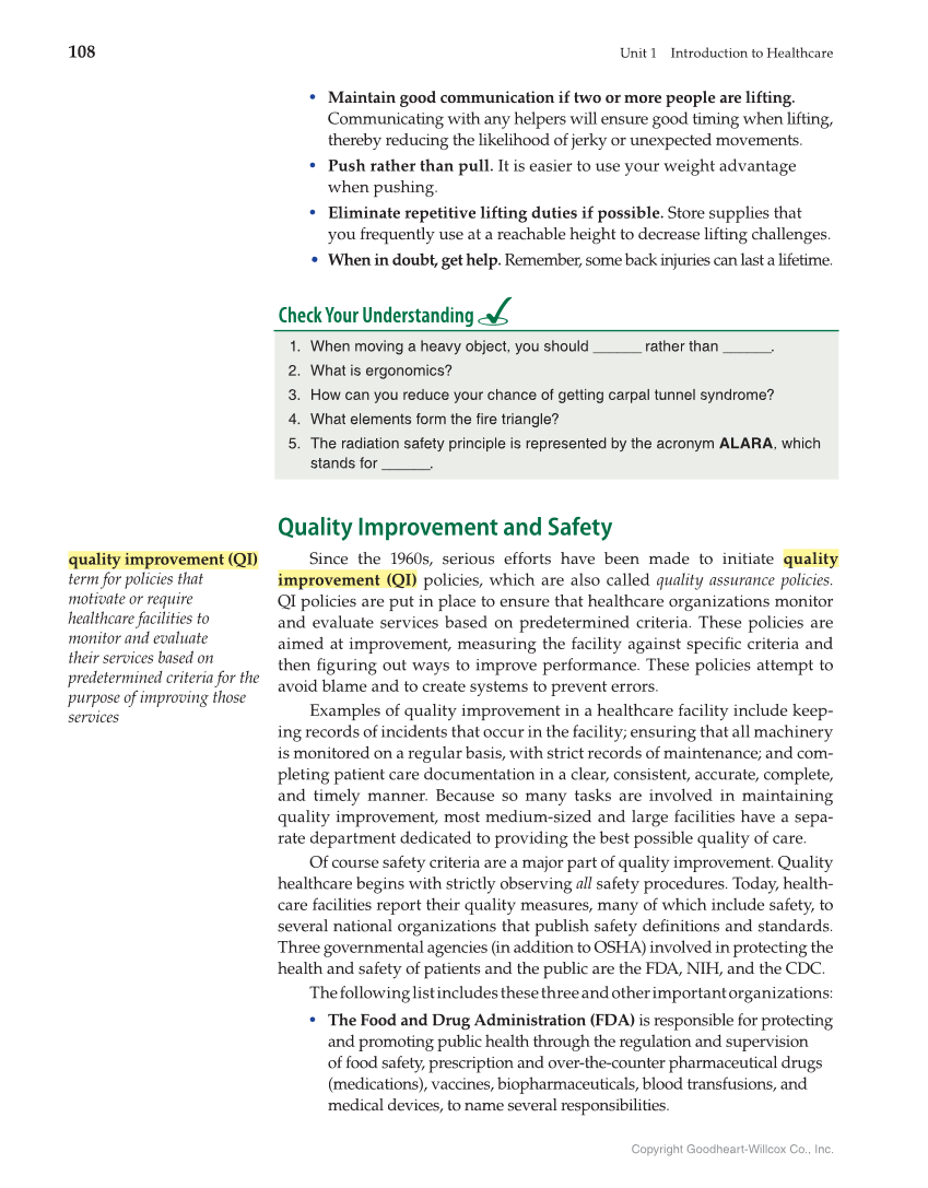 108 Unit 1 Introduction to Healthcare Copyright Goodheart-Willcox Co., Inc. Quality Improvement and Safety Since the 1960s, serious efforts have been made to initiate quality improvement (QI) policies, which are also called quality assurance policies. QI policies are put in place to ensure that healthcare organizations monitor and evaluate services based on predetermined criteria. These policies are aimed at improvement, measuring the facility against specifi c criteria and then fi guring out ways to improve performance. These policies attempt to avoid blame and to create systems to prevent errors. Examples of quality improvement in a healthcare facility include keep- ing records of incidents that occur in the facility ensuring that all machinery is monitored on a regular basis, with strict records of maintenance and com- pleting patient care documentation in a clear, consistent, accurate, complete, and timely manner. Because so many tasks are involved in maintaining quality improvement, most medium-sized and large facilities have a sepa- rate department dedicated to providing the best possible quality of care. Of course safety criteria are a major part of quality improvement. Quality healthcare begins with strictly observing all safety procedures. Today, health- care facilities report their quality measures, many of which include safety, to several national organizations that publish safety defi nitions and standards. Three governmental agencies (in addition to OSHA) involved in protecting the health and safety of patients and the public are the FDA, NIH, and the CDC. The following list includes these three and other important organizations: • The Food and Drug Administration (FDA) is responsible for protecting and promoting public health through the regulation and supervision of food safety, prescription and over-the-counter pharmaceutical drugs (medications), vaccines, biopharmaceuticals, blood transfusions, and medical devices, to name several responsibilities. quality improvement (QI) term for policies that motivate or require healthcare facilities to monitor and evaluate their services based on predetermined criteria for the purpose of improving those services Check Your Understanding 1. When moving a heavy object, you should ______ rather than ______. 2. What is ergonomics? 3. How can you reduce your chance of getting carpal tunnel syndrome? 4. What elements form the fire triangle? 5. The radiation safety principle is represented by the acronym ALARA, which stands for ______. • Maintain good communication if two or more people are lifting. Communicating with any helpers will ensure good timing when lifting, thereby reducing the likelihood of jerky or unexpected movements. • Push rather than pull. It is easier to use your weight advantage when pushing. • Eliminate repetitive lifting duties if possible. Store supplies that you frequently use at a reachable height to decrease lifting challenges. • When in doubt, get help. Remember, some back injuries can last a lifetime.