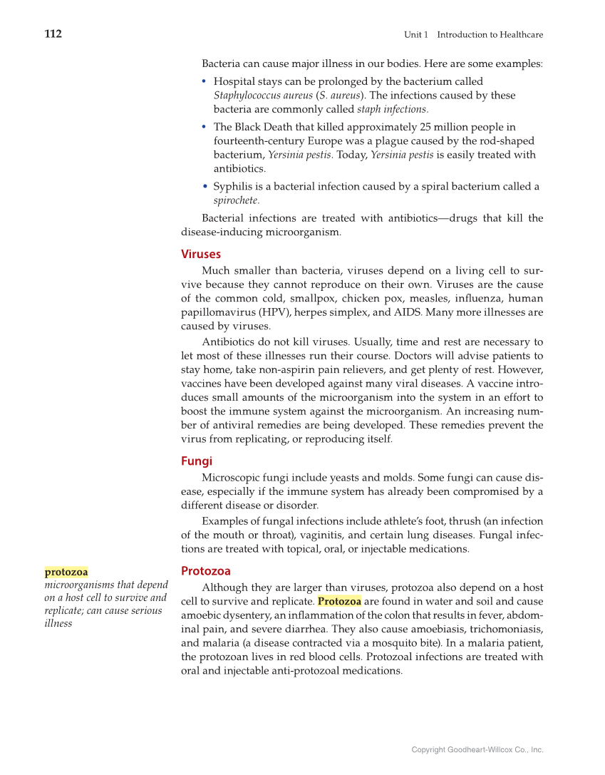 112 Unit 1 Introduction to Healthcare Copyright Goodheart-Willcox Co., Inc. Bacteria can cause major illness in our bodies. Here are some examples: • Hospital stays can be prolonged by the bacterium called Staphylococcus aureus (S. aureus). The infections caused by these bacteria are commonly called staph infections. • The Black Death that killed approximately 25 million people in fourteenth-century Europe was a plague caused by the rod-shaped bacterium, Yersinia pestis. Today, Yersinia pestis is easily treated with antibiotics. • Syphilis is a bacterial infection caused by a spiral bacterium called a spirochete. Bacterial infections are treated with antibiotics—drugs that kill the disease-inducing microorganism. Viruses Much smaller than bacteria, viruses depend on a living cell to sur- vive because they cannot reproduce on their own. Viruses are the cause of the common cold, smallpox, chicken pox, measles, infl uenza, human papillomavirus (HPV), herpes simplex, and AIDS. Many more illnesses are caused by viruses. Antibiotics do not kill viruses. Usually, time and rest are necessary to let most of these illnesses run their course. Doctors will advise patients to stay home, take non-aspirin pain relievers, and get plenty of rest. However, vaccines have been developed against many viral diseases. A vaccine intro- duces small amounts of the microorganism into the system in an effort to boost the immune system against the microorganism. An increasing num- ber of antiviral remedies are being developed. These remedies prevent the virus from replicating, or reproducing itself. Fungi Microscopic fungi include yeasts and molds. Some fungi can cause dis- ease, especially if the immune system has already been compromised by a different disease or disorder. Examples of fungal infections include athlete’s foot, thrush (an infection of the mouth or throat), vaginitis, and certain lung diseases. Fungal infec- tions are treated with topical, oral, or injectable medications. Protozoa Although they are larger than viruses, protozoa also depend on a host cell to survive and replicate. Protozoa are found in water and soil and cause amoebic dysentery, an infl ammation of the colon that results in fever, abdom- inal pain, and severe diarrhea. They also cause amoebiasis, trichomoniasis, and malaria (a disease contracted via a mosquito bite). In a malaria patient, the protozoan lives in red blood cells. Protozoal infections are treated with oral and injectable anti-protozoal medications. protozoa microorganisms that depend on a host cell to survive and replicate can cause serious illness