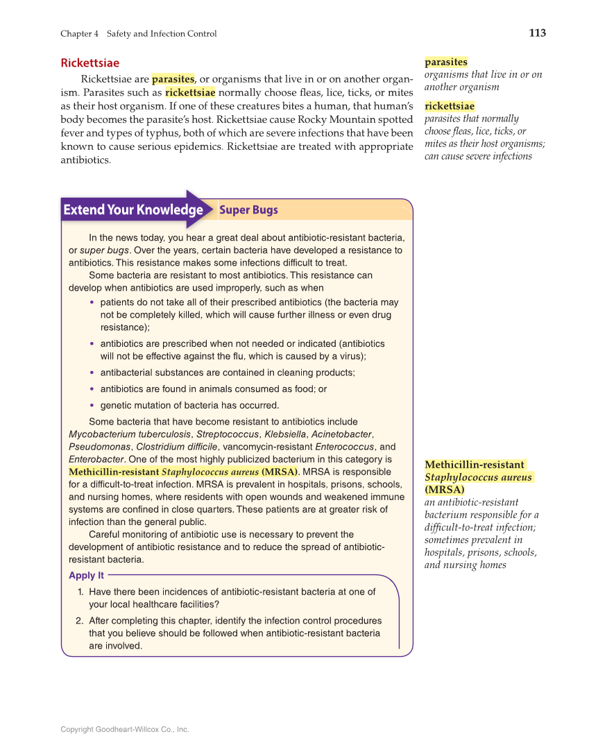 Chapter 4 Safety and Infection Control 113 Copyright Goodheart-Willcox Co., Inc. Rickettsiae Rickettsiae are parasites, or organisms that live in or on another organ- ism. Parasites such as rickettsiae normally choose fl eas, lice, ticks, or mites as their host organism. If one of these creatures bites a human, that human’s body becomes the parasite’s host. Rickettsiae cause Rocky Mountain spotted fever and types of typhus, both of which are severe infections that have been known to cause serious epidemics. Rickettsiae are treated with appropriate antibiotics. parasites organisms that live in or on another organism rickettsiae parasites that normally choose fl eas, lice, ticks, or mites as their host organisms can cause severe infections In the news today, you hear a great deal about antibiotic-resistant bacteria, or super bugs. Over the years, certain bacteria have developed a resistance to antibiotics. This resistance makes some infections difficult to treat. Some bacteria are resistant to most antibiotics. This resistance can develop when antibiotics are used improperly, such as when • patients do not take all of their prescribed antibiotics (the bacteria may not be completely killed, which will cause further illness or even drug resistance) • antibiotics are prescribed when not needed or indicated (antibiotics will not be effective against the flu, which is caused by a virus) • antibacterial substances are contained in cleaning products • antibiotics are found in animals consumed as food or • genetic mutation of bacteria has occurred. Some bacteria that have become resistant to antibiotics include Mycobacterium tuberculosis, Streptococcus, Klebsiella, Acinetobacter, Pseudomonas, Clostridium difficile, vancomycin-resistant Enterococcus, and Enterobacter. One of the most highly publicized bacterium in this category is Methicillin-resistant Staphylococcus aureus (MRSA). MRSA is responsible for a difficult-to-treat infection. MRSA is prevalent in hospitals, prisons, schools, and nursing homes, where residents with open wounds and weakened immune systems are confined in close quarters. These patients are at greater risk of infection than the general public. Careful monitoring of antibiotic use is necessary to prevent the development of antibiotic resistance and to reduce the spread of antibiotic- resistant bacteria. Methicillin-resistant Staphylococcus aureus (MRSA) an antibiotic-resistant bacterium responsible for a diffi cult-to-treat infection sometimes prevalent in hospitals, prisons, schools, and nursing homes Super Bugs Extend Your Knowledge Extend Your Knowledge Apply It 1. Have there been incidences of antibiotic-resistant bacteria at one of your local healthcare facilities? 2. After completing this chapter, identify the infection control procedures that you believe should be followed when antibiotic-resistant bacteria are involved.