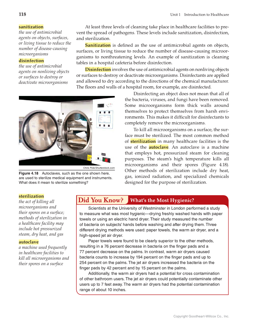 118 Unit 1 Introduction to Healthcare Copyright Goodheart-Willcox Co., Inc. At least three levels of cleaning take place in healthcare facilities to pre- vent the spread of pathogens. These levels include sanitization, disinfection, and sterilization. Sanitization is defi ned as the use of antimicrobial agents on objects, surfaces, or living tissue to reduce the number of disease-causing microor- ganisms to nonthreatening levels. An example of sanitization is cleaning tables in a hospital cafeteria before disinfection. Disinfection involves the use of antimicrobial agents on nonliving objects or surfaces to destroy or deactivate microorganisms. Disinfectants are applied and allowed to dry according to the directions of the chemical manufacturer. The fl oors and walls of a hospital room, for example, are disinfected. Disinfecting an object does not mean that all of the bacteria, viruses, and fungi have been removed. Some microorganisms form thick walls around themselves to protect themselves from harsh envi- ronments. This makes it diffi cult for disinfectants to completely remove the microorganisms. To kill all microorganisms on a surface, the sur- face must be sterilized. The most common method of sterilization in many healthcare facilities is the use of the autoclave. An autoclave is a machine that employs hot, pressurized steam for cleaning purposes. The steam’s high temperature kills all microorganisms and their spores (Figure 4.18). Other methods of sterilization include dry heat, gas, ionized radiation, and specialized chemicals designed for the purpose of sterilization. sanitization the use of antimicrobial agents on objects, surfaces, or living tissue to reduce the number of disease-causing microorganisms disinfection the use of antimicrobial agents on nonliving objects or surfaces to destroy or deactivate microorganisms Scientists at the University of Westminster in London performed a study to measure what was most hygienic—drying freshly washed hands with paper towels or using an electric hand dryer. Their study measured the number of bacteria on subjects’ hands before washing and after drying them. Three different drying methods were used: paper towels, the warm air dryer, and a high-speed jet air dryer. Paper towels were found to be clearly superior to the other methods, resulting in a 76 percent decrease in bacteria on the finger pads and a 77 percent decrease on the palms. In contrast, warm air dryers caused bacteria counts to increase by 194 percent on the finger pads and up to 254 percent on the palms. The jet air dryers increased the bacteria on the finger pads by 42 percent and by 15 percent on the palms. Additionally, the warm air dryers had a potential for cross contamination of other bathroom users. The jet air dryers could potentially contaminate other users up to 7 feet away. The warm air dryers had the potential contamination range of about 10 inches. Did You Know? What’s the Most Hygienic? What’s the Most Hygienic? Chris Pole/Shutterstock.com Figure 4.18 Autoclaves, such as the one shown here, are used to sterilize medical equipment and instruments. What does it mean to sterilize something? autoclave a machine used frequently in healthcare facilities to kill all microorganisms and their spores on a surface sterilization the act of killing all microorganisms and their spores on a surface methods of sterilization in a healthcare facility may include hot pressurized steam, dry heat, and gas