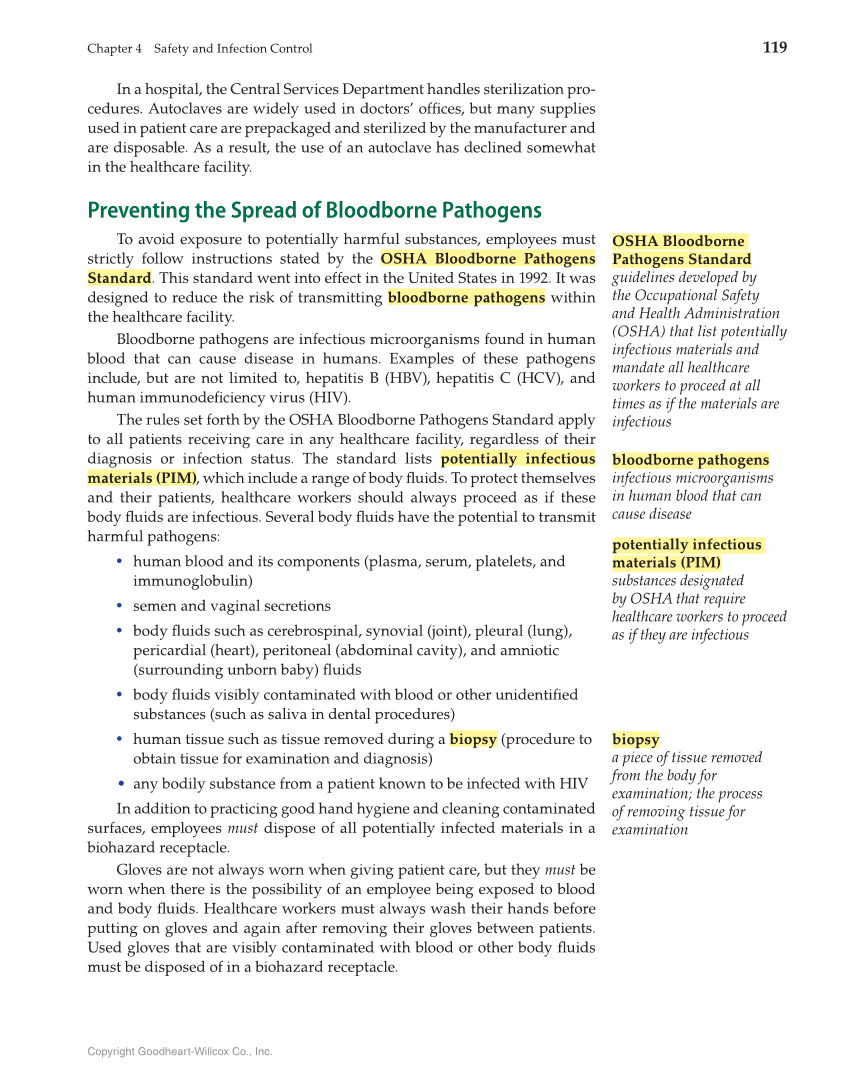 Chapter 4 Safety and Infection Control 119 Copyright Goodheart-Willcox Co., Inc. In a hospital, the Central Services Department handles sterilization pro- cedures. Autoclaves are widely used in doctors’ offi ces, but many supplies used in patient care are prepackaged and sterilized by the manufacturer and are disposable. As a result, the use of an autoclave has declined somewhat in the healthcare facility. Preventing the Spread of Bloodborne Pathogens To avoid exposure to potentially harmful substances, employees must strictly follow instructions stated by the OSHA Bloodborne Pathogens Standard. This standard went into effect in the United States in 1992. It was designed to reduce the risk of transmitting bloodborne pathogens within the healthcare facility. Bloodborne pathogens are infectious microorganisms found in human blood that can cause disease in humans. Examples of these pathogens include, but are not limited to, hepatitis B (HBV), hepatitis C (HCV), and human immunodefi ciency virus (HIV). The rules set forth by the OSHA Bloodborne Pathogens Standard apply to all patients receiving care in any healthcare facility, regardless of their diagnosis or infection status. The standard lists potentially infectious materials (PIM), which include a range of body fl uids. To protect themselves and their patients, healthcare workers should always proceed as if these body fl uids are infectious. Several body fl uids have the potential to transmit harmful pathogens: • human blood and its components (plasma, serum, platelets, and immunoglobulin) • semen and vaginal secretions • body fl uids such as cerebrospinal, synovial (joint), pleural (lung), pericardial (heart), peritoneal (abdominal cavity), and amniotic (surrounding unborn baby) fl uids • body fl uids visibly contaminated with blood or other unidentifi ed substances (such as saliva in dental procedures) • human tissue such as tissue removed during a biopsy (procedure to obtain tissue for examination and diagnosis) • any bodily substance from a patient known to be infected with HIV In addition to practicing good hand hygiene and cleaning contaminated surfaces, employees must dispose of all potentially infected materials in a biohazard receptacle. Gloves are not always worn when giving patient care, but they must be worn when there is the possibility of an employee being exposed to blood and body fl uids. Healthcare workers must always wash their hands before putting on gloves and again after removing their gloves between patients. Used gloves that are visibly contaminated with blood or other body fl uids must be disposed of in a biohazard receptacle. OSHA Bloodborne Pathogens Standard guidelines developed by the Occupational Safety and Health Administration (OSHA) that list potentially infectious materials and mandate all healthcare workers to proceed at all times as if the materials are infectious bloodborne pathogens infectious microorganisms in human blood that can cause disease potentially infectious materials (PIM) substances designated by OSHA that require healthcare workers to proceed as if they are infectious biopsy a piece of tissue removed from the body for examination the process of removing tissue for examination