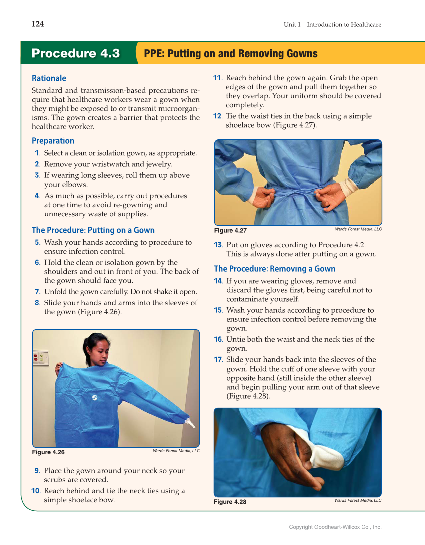 124 Unit 1 Introduction to Healthcare Copyright Goodheart-Willcox Co., Inc. Rationale Standard and transmission-based precautions re- quire that healthcare workers wear a gown when they might be exposed to or transmit microorgan- isms. The gown creates a barrier that protects the healthcare worker. Preparation 1. Select a clean or isolation gown, as appropriate. 2. Remove your wristwatch and jewelry. 3. If wearing long sleeves, roll them up above your elbows. 4. As much as possible, carry out procedures at one time to avoid re-gowning and unnecessary waste of supplies. The Procedure: Putting on a Gown 5. Wash your hands according to procedure to ensure infection control. 6. Hold the clean or isolation gown by the shoulders and out in front of you. The back of the gown should face you. 7. Unfold the gown carefully. Do not shake it open. 8. Slide your hands and arms into the sleeves of the gown (Figure 4.26). Wards Forest Media, LLC Figure 4.26 11. Reach behind the gown again. Grab the open edges of the gown and pull them together so they overlap. Your uniform should be covered completely. 12. Tie the waist ties in the back using a simple shoelace bow (Figure 4.27). Wards Forest Media, LLC Figure 4.27 Wards Forest Media, LLC Figure 4.28 13. Put on gloves according to Procedure 4.2. This is always done after putting on a gown. The Procedure: Removing a Gown 14. If you are wearing gloves, remove and discard the gloves fi rst, being careful not to contaminate yourself. 15. Wash your hands according to procedure to ensure infection control before removing the gown. 16. Untie both the waist and the neck ties of the gown. 17. Slide your hands back into the sleeves of the gown. Hold the cuff of one sleeve with your opposite hand (still inside the other sleeve) and begin pulling your arm out of that sleeve (Figure 4.28). Procedure 4.3 PPE: Putting on and Removing Gowns 9. Place the gown around your neck so your scrubs are covered. 10. Reach behind and tie the neck ties using a simple shoelace bow.