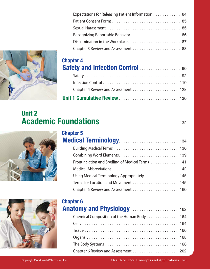 Health Science: Concepts and Applications vii Copyright Goodheart-Willcox Co., Inc. Expectations for Releasing Patient Information . . . . . . . . . . . . 84 Patient Consent Forms . . . . . . . . . . . . . . . . . . . . . . . . . . . . . . 85 Sexual Harassment . . . . . . . . . . . . . . . . . . . . . . . . . . . . . . . . 85 Recognizing Reportable Behavior. . . . . . . . . . . . . . . . . . . . . . 86 Discrimination in the Workplace . . . . . . . . . . . . . . . . . . . . . . . 87 Chapter 3 Review and Assessment . . . . . . . . . . . . . . . . . . . . . 88 Chapter 4 Safety and Infection Control . . . . . . . . . . . . . . . . . . 90 Safety . . . . . . . . . . . . . . . . . . . . . . . . . . . . . . . . . . . . . . . . . . 92 Infection Control . . . . . . . . . . . . . . . . . . . . . . . . . . . . . . . . . 110 Chapter 4 Review and Assessment . . . . . . . . . . . . . . . . . . . . 128 Unit 1 Cumulative Review . . . . . . . . . . . . . . . . . . . . . . . . . . 130 Unit 2 Academic Foundations . . . . . . . . . . . . . . . . . . . . . . . . . . . . . . . . . . . . . . . 132 Chapter 5 Medical Terminology. . . . . . . . . . . . . . . . . . . . . . . . . . 134 Building Medical Terms . . . . . . . . . . . . . . . . . . . . . . . . . . . . 136 Combining Word Elements. . . . . . . . . . . . . . . . . . . . . . . . . . 139 Pronunciation and Spelling of Medical Terms . . . . . . . . . . . . 141 Medical Abbreviations . . . . . . . . . . . . . . . . . . . . . . . . . . . . . 142 Using Medical Terminology Appropriately. . . . . . . . . . . . . . . 145 Terms for Location and Movement . . . . . . . . . . . . . . . . . . . . 145 Chapter 5 Review and Assessment . . . . . . . . . . . . . . . . . . . . 160 Chapter 6 Anatomy and Physiology . . . . . . . . . . . . . . . . . . . . . 162 Chemical Composition of the Human Body . . . . . . . . . . . . . . 164 Cells . . . . . . . . . . . . . . . . . . . . . . . . . . . . . . . . . . . . . . . . . . 164 Tissue . . . . . . . . . . . . . . . . . . . . . . . . . . . . . . . . . . . . . . . . . 166 Organs . . . . . . . . . . . . . . . . . . . . . . . . . . . . . . . . . . . . . . . . 168 The Body Systems . . . . . . . . . . . . . . . . . . . . . . . . . . . . . . . . 168 Chapter 6 Review and Assessment . . . . . . . . . . . . . . . . . . . . 202
