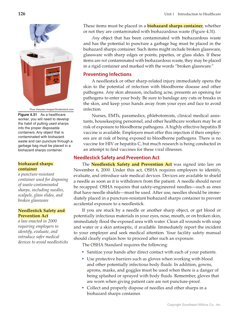 126 Unit 1 Introduction to Healthcare Copyright Goodheart-Willcox Co., Inc. These items must be placed in a biohazard sharps container, whether or not they are contaminated with biohazardous waste (Figure 4.31). Any object that has been contaminated with biohazardous waste and has the potential to puncture a garbage bag must be placed in the biohazard sharps container. Such items might include broken glassware, glassware with sharp edges or points, pipettes, or glass slides. If these items are not contaminated with biohazardous waste, they may be placed in a rigid container and marked with the words “broken glassware.” Preventing Infections A needlestick or other sharp-related injury immediately opens the skin to the potential of infection with bloodborne disease and other pathogens. Any skin abrasion, including acne, presents an opening for pathogens to enter your body. Be sure to bandage any cuts or breaks in the skin, and keep your hands away from your eyes and face to avoid infection. Nurses, EMTs, paramedics, phlebotomists, clinical medical assis- tants, housekeeping personnel, and other healthcare workers may be at risk of exposure to bloodborne pathogens. A highly effective hepatitis B vaccine is available. Employers must offer this injection if their employ- ees are at risk of being exposed to bloodborne pathogens. There is no vaccine for HIV or hepatitis C, but much research is being conducted in an attempt to fi nd vaccines for these viral illnesses. Needlestick Safety and Prevention Act The Needlestick Safety and Prevention Act was signed into law on November 6, 2000. Under this act, OSHA requires employers to identify, evaluate, and introduce safe medical devices. Devices are available to shield a needle as soon as it is withdrawn from the patient. A needle should never be recapped. OSHA requires that safety-engineered needles—such as ones that have needle shields—must be used. After use, needles should be imme- diately placed in a puncture-resistant biohazard sharps container to prevent accidental exposure to a needlestick. If you are stuck by a needle or another sharp object, or get blood or potentially infectious materials in your eyes, nose, mouth, or on broken skin, immediately fl ood the exposed area with water. Clean all wounds with soap and water or a skin antiseptic, if available. Immediately report the incident to your employer and seek medical attention. Your facility safety manual should clearly explain how to proceed after such an exposure. The OSHA Standard requires the following: • Sanitize your hands after direct contact with each of your patients. • Use protective barriers such as gloves when working with blood and other potentially infectious body fl uids. In addition, gowns, aprons, masks, and goggles must be used when there is a danger of being splashed or sprayed with body fl uids. Remember, gloves that are worn when giving patient care are not puncture-proof. • Collect and properly dispose of needles and other sharps in a biohazard sharps container. biohazard sharps container a puncture-resistant container used for disposing of waste-contaminated sharps, including needles, scalpels, glass slides, and broken glassware Needlestick Safety and Prevention Act a law enacted in 2000 requiring employers to identify, evaluate, and introduce safer medical devices to avoid needlesticks Thom Hanssen Images/Shutterstock.com Figure 4.31 As a healthcare worker, you will need to develop the habit of putting used sharps into the proper disposable containers. Any object that is contaminated with biohazard waste and can puncture through a garbage bag must be placed in a biohazard sharps container.