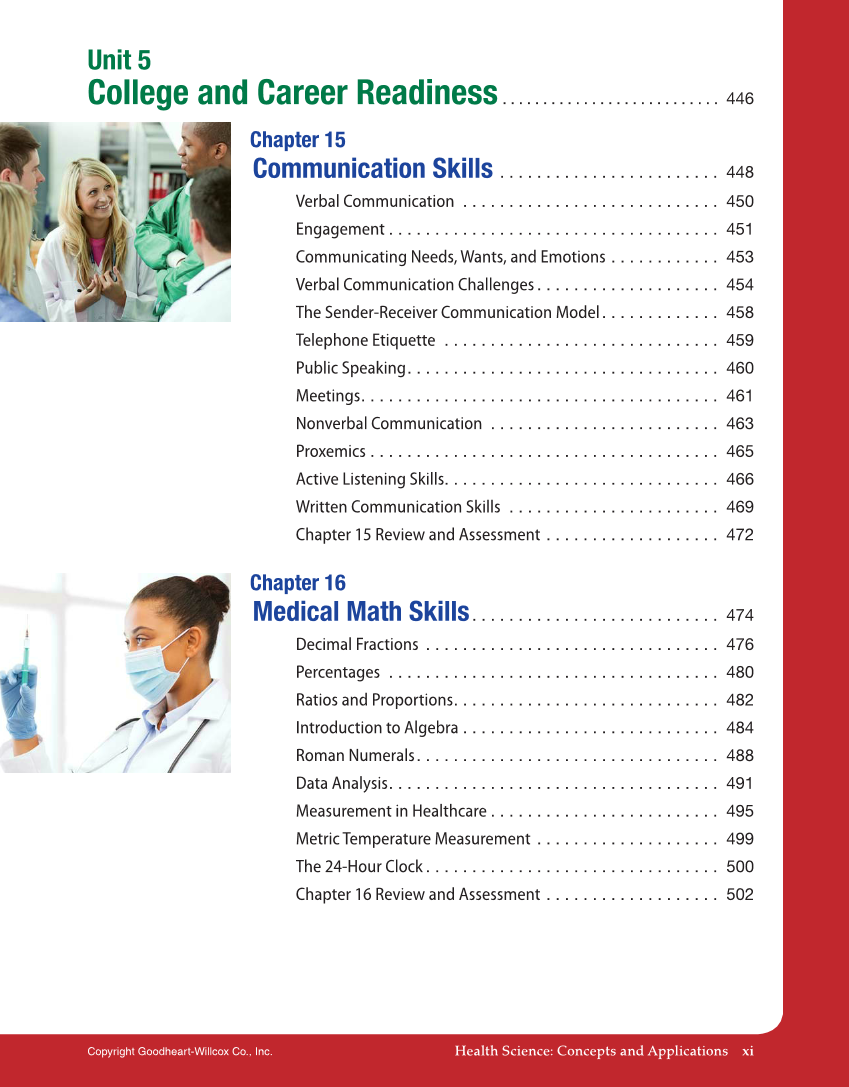 Health Science: Concepts and Applications xi Copyright Goodheart-Willcox Co., Inc. Unit 5 College and Career Readiness . . . . . . . . . . . . . . . . . . . . . . . . . . . 446 Chapter 15 Communication Skills . . . . . . . . . . . . . . . . . . . . . . . . 448 Verbal Communication . . . . . . . . . . . . . . . . . . . . . . . . . . . . 450 Engagement . . . . . . . . . . . . . . . . . . . . . . . . . . . . . . . . . . . . 451 Communicating Needs, Wants, and Emotions . . . . . . . . . . . . 453 Verbal Communication Challenges . . . . . . . . . . . . . . . . . . . . 454 The Sender-Receiver Communication Model . . . . . . . . . . . . . 458 Telephone Etiquette . . . . . . . . . . . . . . . . . . . . . . . . . . . . . . 459 Public Speaking. . . . . . . . . . . . . . . . . . . . . . . . . . . . . . . . . . 460 Meetings. . . . . . . . . . . . . . . . . . . . . . . . . . . . . . . . . . . . . . . 461 Nonverbal Communication . . . . . . . . . . . . . . . . . . . . . . . . . 463 Proxemics . . . . . . . . . . . . . . . . . . . . . . . . . . . . . . . . . . . . . . 465 Active Listening Skills. . . . . . . . . . . . . . . . . . . . . . . . . . . . . . 466 Written Communication Skills . . . . . . . . . . . . . . . . . . . . . . . 469 Chapter 15 Review and Assessment . . . . . . . . . . . . . . . . . . . 472 Chapter 16 Medical Math Skills . . . . . . . . . . . . . . . . . . . . . . . . . . . 474 Decimal Fractions . . . . . . . . . . . . . . . . . . . . . . . . . . . . . . . . 476 Percentages . . . . . . . . . . . . . . . . . . . . . . . . . . . . . . . . . . . . 480 Ratios and Proportions. . . . . . . . . . . . . . . . . . . . . . . . . . . . . 482 Introduction to Algebra . . . . . . . . . . . . . . . . . . . . . . . . . . . . 484 Roman Numerals. . . . . . . . . . . . . . . . . . . . . . . . . . . . . . . . . 488 Data Analysis. . . . . . . . . . . . . . . . . . . . . . . . . . . . . . . . . . . . 491 Measurement in Healthcare . . . . . . . . . . . . . . . . . . . . . . . . . 495 Metric Temperature Measurement . . . . . . . . . . . . . . . . . . . . 499 The 24-Hour Clock . . . . . . . . . . . . . . . . . . . . . . . . . . . . . . . . 500 Chapter 16 Review and Assessment . . . . . . . . . . . . . . . . . . . 502