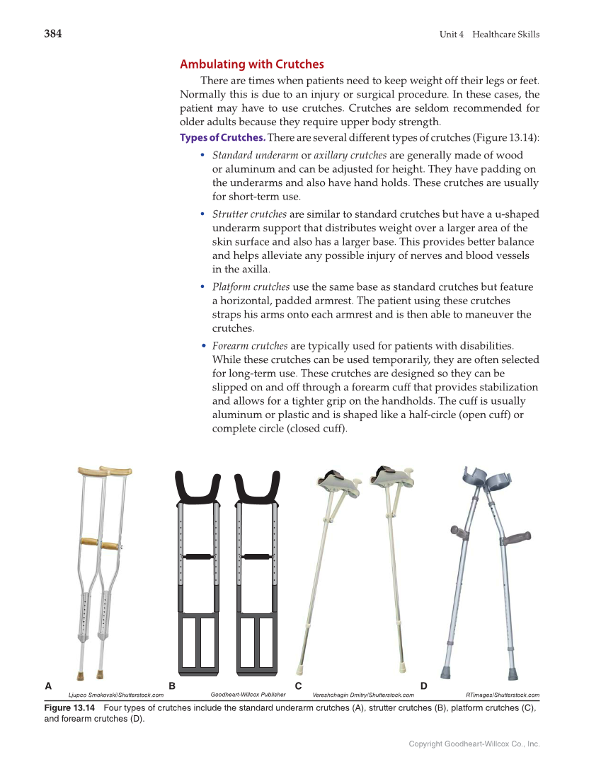 384 Unit 4 Healthcare Skills Copyright Goodheart-Willcox Co., Inc. Ambulating with Crutches There are times when patients need to keep weight off their legs or feet. Normally this is due to an injury or surgical procedure. In these cases, the patient may have to use crutches. Crutches are seldom recommended for older adults because they require upper body strength. Types of Crutches. There are several different types of crutches (Figure 13.14): • Standard underarm or axillary crutches are generally made of wood or aluminum and can be adjusted for height. They have padding on the underarms and also have hand holds. These crutches are usually for short-term use. • Strutter crutches are similar to standard crutches but have a u-shaped underarm support that distributes weight over a larger area of the skin surface and also has a larger base. This provides better balance and helps alleviate any possible injury of nerves and blood vessels in the axilla. • Platform crutches use the same base as standard crutches but feature a horizontal, padded armrest. The patient using these crutches straps his arms onto each armrest and is then able to maneuver the crutches. • Forearm crutches are typically used for patients with disabilities. While these crutches can be used temporarily, they are often selected for long-term use. These crutches are designed so they can be slipped on and off through a forearm cuff that provides stabilization and allows for a tighter grip on the handholds. The cuff is usually aluminum or plastic and is shaped like a half-circle (open cuff) or complete circle (closed cuff). RTimages/Shutterstock.com Figure 13.14 Four types of crutches include the standard underarm crutches (A), strutter crutches (B), platform crutches (C), and forearm crutches (D). Ljupco Smokovski/Shutterstock.com Goodheart-Willcox Publisher A B D Vereshchagin Dmitry/Shutterstock.com C
