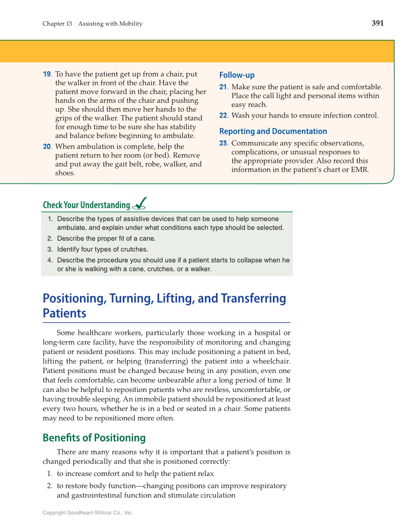 Chapter 13 Assisting with Mobility 391 Copyright Goodheart-Willcox Co., Inc. 19. To have the patient get up from a chair, put the walker in front of the chair. Have the patient move forward in the chair, placing her hands on the arms of the chair and pushing up. She should then move her hands to the grips of the walker. The patient should stand for enough time to be sure she has stability and balance before beginning to ambulate. 20. When ambulation is complete, help the patient return to her room (or bed). Remove and put away the gait belt, robe, walker, and shoes. Follow-up 21. Make sure the patient is safe and comfortable. Place the call light and personal items within easy reach. 22. Wash your hands to ensure infection control. Reporting and Documentation 23. Communicate any specifi c observations, complications, or unusual responses to the appropriate provider. Also record this information in the patient’s chart or EMR. Check Your Understanding 1. Describe the types of assistive devices that can be used to help someone ambulate, and explain under what conditions each type should be selected. 2. Describe the proper fit of a cane. 3. Identify four types of crutches. 4. Describe the procedure you should use if a patient starts to collapse when he or she is walking with a cane, crutches, or a walker. Positioning, Turning, Lifting, and Transferring Patients Some healthcare workers, particularly those working in a hospital or long-term care facility, have the responsibility of monitoring and changing patient or resident positions. This may include positioning a patient in bed, lifting the patient, or helping (transferring) the patient into a wheelchair. Patient positions must be changed because being in any position, even one that feels comfortable, can become unbearable after a long period of time. It can also be helpful to reposition patients who are restless, uncomfortable, or having trouble sleeping. An immobile patient should be repositioned at least every two hours, whether he is in a bed or seated in a chair. Some patients may need to be repositioned more often. Benefi ts of Positioning There are many reasons why it is important that a patient’s position is changed periodically and that she is positioned correctly: 1. to increase comfort and to help the patient relax 2. to restore body function—changing positions can improve respiratory and gastrointestinal function and stimulate circulation