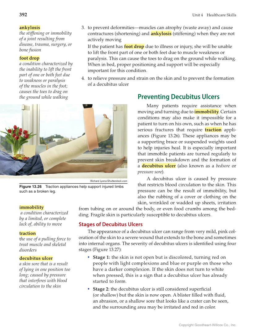 392 Unit 4 Healthcare Skills Copyright Goodheart-Willcox Co., Inc. 3. to prevent deformities—muscles can atrophy (waste away) and cause contractures (shortening) and ankylosis (stiffening) when they are not actively moving If the patient has foot drop due to illness or injury, she will be unable to lift the front part of one or both feet due to muscle weakness or paralysis. This can cause the toes to drag on the ground while walking. When in bed, proper positioning and support will be especially important for this condition. 4. to relieve pressure and strain on the skin and to prevent the formation of a decubitus ulcer Preventing Decubitus Ulcers Many patients require assistance when moving and turning due to immobility. Certain conditions may also make it impossible for a patient to turn on his own, such as when he has serious fractures that require traction appli- ances (Figure 13.26). These appliances may be a supporting brace or suspended weights used to help injuries heal. It is especially important that immobile patients are turned regularly to prevent skin breakdown and the formation of a decubitus ulcer (also known as a bedsore or pressure sore). A decubitus ulcer is caused by pressure that restricts blood circulation to the skin. This pressure can be the result of immobility, but also the rubbing of a cover or clothing on the skin, wrinkled or wadded up sheets, irritation from tubing on or around the body, or even food crumbs among the bed- ding. Fragile skin is particularly susceptible to decubitus ulcers. Stages of Decubitus Ulcers The appearance of a decubitus ulcer can range from very mild, pink col- oration of the skin to a severe wound that extends to the bone and sometimes into internal organs. The severity of decubitus ulcers is identifi ed using four stages (Figure 13.27): • Stage 1: the skin is not open but is discolored, turning red on people with light complexions and blue or purple on those who have a darker complexion. If the skin does not turn to white when pressed, this is a sign that a decubitus ulcer has already started to form. • Stage 2: the decubitus ulcer is still considered superfi cial (or shallow) but the skin is now open. A blister fi lled with fl uid, an abrasion, or a shallow sore that looks like a crater can be seen, and the surrounding area may be irritated and red in color. ankylosis the stiffening or immobility of a joint resulting from disease, trauma, surgery, or bone fusion foot drop a condition characterized by the inability to lift the front part of one or both feet due to weakness or paralysis of the muscles in the foot causes the toes to drag on the ground while walking immobility a condition characterized by a limited, or complete lack of, ability to move traction the use of a pulling force to treat muscle and skeletal disorders decubitus ulcer a skin sore that is a result of lying in one position too long caused by pressure that interferes with blood circulation to the skin Richard Lyons/Shutterstock.com Figure 13.26 Traction appliances help support injured limbs such as a broken leg.