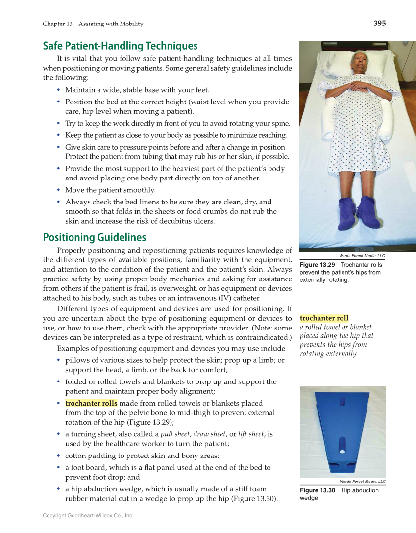Chapter 13 Assisting with Mobility 395 Copyright Goodheart-Willcox Co., Inc. Safe Patient-Handling Techniques It is vital that you follow safe patient-handling techniques at all times when positioning or moving patients. Some general safety guidelines include the following: • Maintain a wide, stable base with your feet. • Position the bed at the correct height (waist level when you provide care, hip level when moving a patient). • Try to keep the work directly in front of you to avoid rotating your spine. • Keep the patient as close to your body as possible to minimize reaching. • Give skin care to pressure points before and after a change in position. Protect the patient from tubing that may rub his or her skin, if possible. • Provide the most support to the heaviest part of the patient’s body and avoid placing one body part directly on top of another. • Move the patient smoothly. • Always check the bed linens to be sure they are clean, dry, and smooth so that folds in the sheets or food crumbs do not rub the skin and increase the risk of decubitus ulcers. Positioning Guidelines Properly positioning and repositioning patients requires knowledge of the different types of available positions, familiarity with the equipment, and attention to the condition of the patient and the patient’s skin. Always practice safety by using proper body mechanics and asking for assistance from others if the patient is frail, is overweight, or has equipment or devices attached to his body, such as tubes or an intravenous (IV) catheter. Different types of equipment and devices are used for positioning. If you are uncertain about the type of positioning equipment or devices to use, or how to use them, check with the appropriate provider. (Note: some devices can be interpreted as a type of restraint, which is contraindicated.) Examples of positioning equipment and devices you may use include • pillows of various sizes to help protect the skin prop up a limb or support the head, a limb, or the back for comfort • folded or rolled towels and blankets to prop up and support the patient and maintain proper body alignment • trochanter rolls made from rolled towels or blankets placed from the top of the pelvic bone to mid-thigh to prevent external rotation of the hip (Figure 13.29) • a turning sheet, also called a pull sheet, draw sheet, or lift sheet, is used by the healthcare worker to turn the patient • cotton padding to protect skin and bony areas • a foot board, which is a fl at panel used at the end of the bed to prevent foot drop and • a hip abduction wedge, which is usually made of a stiff foam rubber material cut in a wedge to prop up the hip (Figure 13.30). trochanter roll a rolled towel or blanket placed along the hip that prevents the hips from rotating externally Wards Forest Media, LLC Figure 13.29 Trochanter rolls prevent the patient’s hips from externally rotating. Wards Forest Media, LLC Figure 13.30 Hip abduction wedge