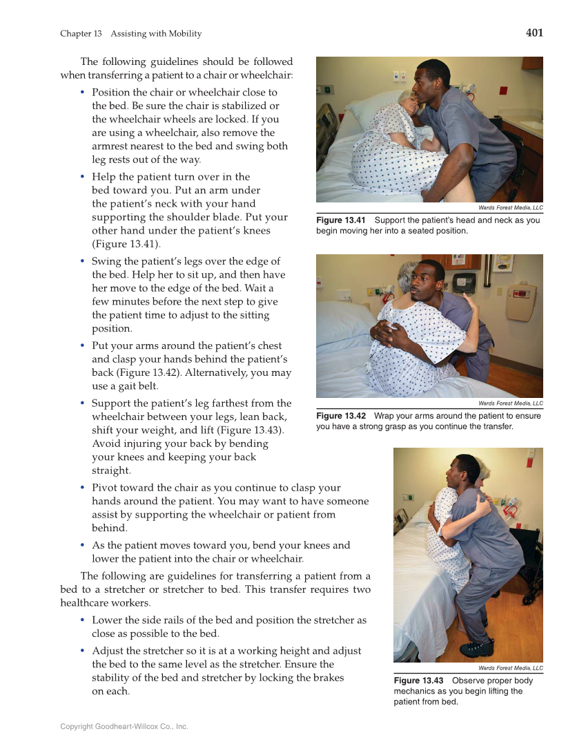 Chapter 13 Assisting with Mobility 401 Copyright Goodheart-Willcox Co., Inc. The following guidelines should be followed when transferring a patient to a chair or wheelchair: • Position the chair or wheelchair close to the bed. Be sure the chair is stabilized or the wheelchair wheels are locked. If you are using a wheelchair, also remove the armrest nearest to the bed and swing both leg rests out of the way. • Help the patient turn over in the bed toward you. Put an arm under the patient’s neck with your hand supporting the shoulder blade. Put your other hand under the patient’s knees (Figure 13.41). • Swing the patient’s legs over the edge of the bed. Help her to sit up, and then have her move to the edge of the bed. Wait a few minutes before the next step to give the patient time to adjust to the sitting position. • Put your arms around the patient’s chest and clasp your hands behind the patient’s back (Figure 13.42). Alternatively, you may use a gait belt. • Support the patient’s leg farthest from the wheelchair between your legs, lean back, shift your weight, and lift (Figure 13.43). Avoid injuring your back by bending your knees and keeping your back straight. • Pivot toward the chair as you continue to clasp your hands around the patient. You may want to have someone assist by supporting the wheelchair or patient from behind. • As the patient moves toward you, bend your knees and lower the patient into the chair or wheelchair. The following are guidelines for transferring a patient from a bed to a stretcher or stretcher to bed. This transfer requires two healthcare workers. • Lower the side rails of the bed and position the stretcher as close as possible to the bed. • Adjust the stretcher so it is at a working height and adjust the bed to the same level as the stretcher. Ensure the stability of the bed and stretcher by locking the brakes on each. Wards Forest Media, LLC Figure 13.42 Wrap your arms around the patient to ensure you have a strong grasp as you continue the transfer. Wards Forest Media, LLC Figure 13.43 Observe proper body mechanics as you begin lifting the patient from bed. Wards Forest Media, LLC Figure 13.41 Support the patient’s head and neck as you begin moving her into a seated position.