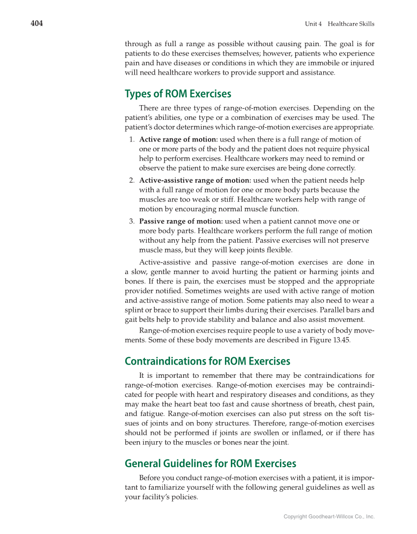 404 Unit 4 Healthcare Skills Copyright Goodheart-Willcox Co., Inc. through as full a range as possible without causing pain. The goal is for patients to do these exercises themselves however, patients who experience pain and have diseases or conditions in which they are immobile or injured will need healthcare workers to provide support and assistance. Types of ROM Exercises There are three types of range-of-motion exercises. Depending on the patient’s abilities, one type or a combination of exercises may be used. The patient’s doctor determines which range-of-motion exercises are appropriate. 1. Active range of motion: used when there is a full range of motion of one or more parts of the body and the patient does not require physical help to perform exercises. Healthcare workers may need to remind or observe the patient to make sure exercises are being done correctly. 2. Active-assistive range of motion: used when the patient needs help with a full range of motion for one or more body parts because the muscles are too weak or stiff. Healthcare workers help with range of motion by encouraging normal muscle function. 3. Passive range of motion: used when a patient cannot move one or more body parts. Healthcare workers perform the full range of motion without any help from the patient. Passive exercises will not preserve muscle mass, but they will keep joints fl exible. Active-assistive and passive range-of-motion exercises are done in a slow, gentle manner to avoid hurting the patient or harming joints and bones. If there is pain, the exercises must be stopped and the appropriate provider notifi ed. Sometimes weights are used with active range of motion and active-assistive range of motion. Some patients may also need to wear a splint or brace to support their limbs during their exercises. Parallel bars and gait belts hel p to provide stability and balance and also assist movement. Range-of-motion exercises require people to use a variety of body move- ments. Some of these body movements are described in Figure 13.45. Contraindications for ROM Exercises It is important to remember that there may be contraindications for range-of-motion exercises. Range-of-motion exercises may be contraindi- cated for people with heart and respiratory diseases and conditions, as they may make the heart beat too fast and cause shortness of breath, chest pain, and fatigue. Range-of-motion exercises can also put stress on the soft tis- sues of joints and on bony structures. Therefore, range-of-motion exercises should not be performed if joints are swollen or infl amed, or if t here has been injury to the muscles or bones near the joint. General Guidelines for ROM Exercises Before you conduct range-of-motion exercises with a patient, it is impor- tant to familiarize yourself with the following general guidelines as well as your facility’s policies.